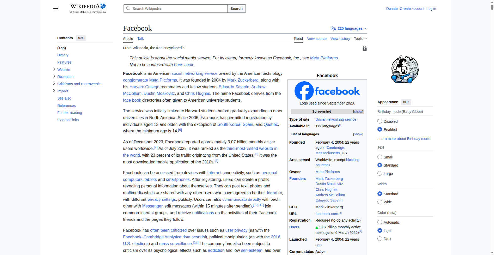 | Offenders: https://upload.wikimedia.org/wikipedia/en/thumb/1/1b/Semi-protection-shackle.svg...n-shackle.svg.png https://upload.wikimedia.org/wikipedia/commons/thumb/b/b9/2023_Facebook_icon.svg...book_icon.svg.png https://upload.wikimedia.org/wikipedia/commons/thumb/9/93/Facebook_logo_%282023%...282023%29.svg.png https://upload.wikimedia.org/wikipedia/en/6/64/Facebook_user_page.png https://upload.wikimedia.org/wikipedia/commons/thumb/b/b0/Increase2.svg/20px-Increase2.svg.png https://upload.wikimedia.org/wikipedia/commons/thumb/0/05/Meta_Platforms_Inc._lo...ropped%29.svg.png https://upload.wikimedia.org/wikipedia/commons/thumb/9/99/Wiktionary-logo-en-v2....ogo-en-v2.svg.png https://upload.wikimedia.org/wikipedia/en/thumb/4/4a/Commons-logo.svg/20px-Commons-logo.svg.png https://upload.wikimedia.org/wikipedia/commons/thumb/2/24/Wikinews-logo.svg/40px...news-logo.svg.png https://upload.wikimedia.org/wikipedia/commons/thumb/f/fa/Wikiquote-logo.svg/40p...uote-logo.svg.png https://upload.wikimedia.org/wikipedia/commons/thumb/3/32/Scholia_logo.svg/40px-Scholia_logo.svg.png https://upload.wikimedia.org/wikipedia/en/thumb/8/8a/OOjs_UI_icon_edit-ltr-progr...ogressive.svg.png https://upload.wikimedia.org/wikipedia/commons/thumb/f/fc/MarkZuckerberg-crop.jp...ckerberg-crop.jpg https://upload.wikimedia.org/wikipedia/en/thumb/1/12/Original-facebook.jpg/250px...inal-facebook.jpg https://upload.wikimedia.org/wikipedia/commons/thumb/0/06/Facebook.svg/250px-Facebook.svg.png https://upload.wikimedia.org/wikipedia/commons/thumb/6/69/Screen_of_Facebook_%28...ebook_%282%29.PNG https://upload.wikimedia.org/wikipedia/commons/3/38/Facebook_Like_React.png https://upload.wikimedia.org/wikipedia/commons/thumb/f/f4/Facebook_t-shirt_with_...d_for_Hackers.jpg https://upload.wikimedia.org/wikipedia/commons/thumb/5/5d/Population_pyramid_of_..._users_by_age.png https://upload.wikimedia.org/wikipedia/commons/thumb/9/9c/Facebook_censorship.sv...ensorship.svg.png https://upload.wikimedia.org/wikipedia/commons/thumb/f/f3/PRISM_Collection_Detai...ction_Details.jpg https://upload.wikimedia.org/wikipedia/commons/thumb/6/62/Onavo_logo.png/250px-Onavo_logo.png https://upload.wikimedia.org/wikipedia/commons/thumb/2/26/Hands_Off%21_protest%2...5%2C_2025-053.jpg https://upload.wikimedia.org/wikipedia/commons/thumb/c/c9/Berlin_%289163009052%2...9163009052%29.jpg https://upload.wikimedia.org/wikipedia/commons/thumb/6/61/Ad-tech_London_2010_%2..._2010_%285%29.JPG https://upload.wikimedia.org/wikipedia/commons/thumb/2/27/2011_Egyptian_protests...26_jan25_card.jpg https://upload.wikimedia.org/wikipedia/commons/thumb/9/99/SF_Pride_2014_-_Stierc...4_-_Stierch_7.jpg https://upload.wikimedia.org/wikipedia/commons/thumb/2/2a/Industry5.svg/40px-Industry5.svg.png https://upload.wikimedia.org/wikipedia/commons/thumb/f/f9/Crystal_Clear_app_linn...ghborhood.svg.png https://upload.wikimedia.org/wikipedia/commons/a/aa/Lock-red-alt-2.svg https://upload.wikimedia.org/wikipedia/commons/4/4d/Icon_pdf_file.png https://upload.wikimedia.org/wikipedia/commons/6/65/Lock-green.svg https://upload.wikimedia.org/wikipedia/commons/d/d6/Lock-gray-alt-2.svg https://en.wikipedia.org/wiki/Special:CentralAutoLogin/start?useformat=desktop&type=script&usesul3=1 https://auth.wikimedia.org/metawiki/wiki/Special:CentralAutoLogin/checkLoggedIn...gin/checkLoggedIn |
