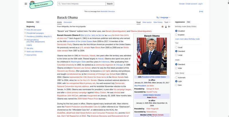 | <img alt="Obama standing with his arms folded and smiling" resource="https://en.wikipedia.beta.wmcloud.org/wiki/File:President_Barack_Obama.jpg" src="https://upload.wikimedia.org/wikipedia/commons/thumb/8/8d/President_Barack_Obama.jpg/250px-President_Barack_Obama.jpg?utm_source=en.wikipedia.beta.wmcloud.org&utm_campaign=index&utm_content=thumbnail" decoding="async" data-file-width="2687" data-file-height="3356" data-file-type="bitmap" height="312" width="250" srcset="https://upload.wikimedia.org/wikipedia/commons/thumb/8/8d/President_Barack_Obama.jpg/500px-President_Barack_Obama.jpg?utm_source=en.wikipedia.beta.wmcloud.org&utm_campaign=index&utm_content=thumbnail 1.5x, https://upload.wikimedia.org/wikipedia/commons/thumb/8/8d/President_Barack_Obama.jpg/500px-President_Barack_Obama.jpg?utm_source=en.wikipedia.beta.wmcloud.org&utm_campaign=index&utm_content=thumbnail 2x" class="mw-file-element mw-file-upright" style="--mw-file-upright: 1" id="mwHA"> | |||||