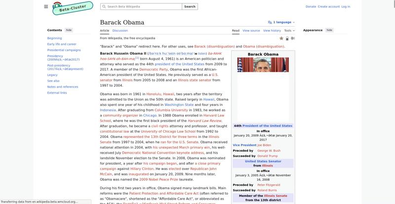 | Offenders: https://en.wikipedia.beta.wmcloud.org/static/images/project-logos/wikimedia-cloud-services.svg https://upload.wikimedia.org/wikipedia/commons/thumb/1/11/Barack_Obama_signature...signature.svg.png https://upload.wikimedia.org/wikipedia/commons/thumb/5/50/2004_Illinois_Senate_r...e_results.svg.png https://upload.wikimedia.org/wikipedia/commons/thumb/2/2b/58th_Presidential_Inau...-D-BP749-1327.jpg https://upload.wikimedia.org/wikipedia/commons/thumb/9/9f/Job_Growth_by_U.S._Pre...resident_-_v1.png |