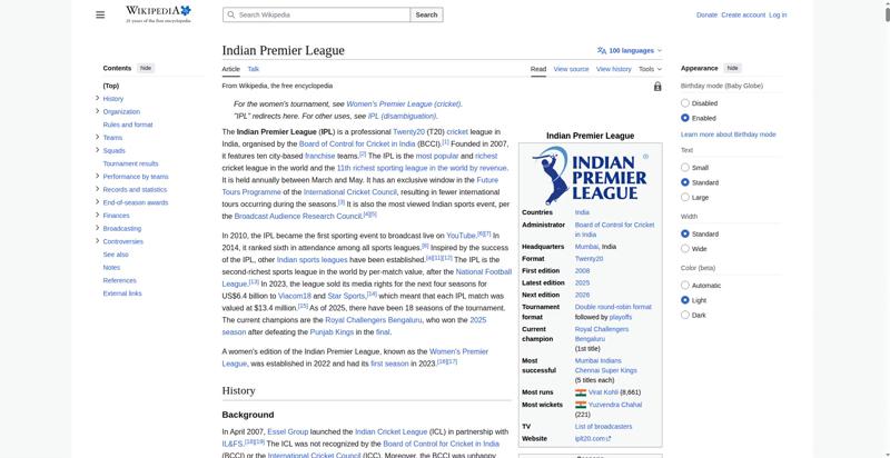 | Offenders: https://upload.wikimedia.org/wikipedia/en/thumb/1/1b/Semi-protection-shackle.svg...n-shackle.svg.png https://upload.wikimedia.org/wikipedia/en/thumb/8/84/Indian_Premier_League_Offic...cial_Logo.svg.png https://upload.wikimedia.org/wikipedia/en/thumb/4/41/Flag_of_India.svg/40px-Flag_of_India.svg.png https://upload.wikimedia.org/wikipedia/commons/thumb/6/67/IPL_T20_Chennai_vs_Kol...ai_vs_Kolkata.JPG https://upload.wikimedia.org/wikipedia/commons/thumb/a/a5/Flag_of_the_United_Kin...%281-2%29.svg.png https://upload.wikimedia.org/wikipedia/commons/thumb/a/af/Flag_of_South_Africa.s...th_Africa.svg.png https://upload.wikimedia.org/wikipedia/commons/thumb/d/dc/India_location_map.svg...ation_map.svg.png https://upload.wikimedia.org/wikipedia/commons/thumb/c/cb/Flag_of_the_United_Ara..._Emirates.svg.png https://upload.wikimedia.org/wikipedia/commons/thumb/1/18/WestIndiesCricketFlagP...agPre1999.svg.png https://upload.wikimedia.org/wikipedia/en/thumb/a/a4/Flag_of_the_United_States.s...ed_States.svg.png https://upload.wikimedia.org/wikipedia/commons/thumb/0/0c/Red_pog.svg/20px-Red_pog.svg.png https://upload.wikimedia.org/wikipedia/en/timeline/2157om5n8gyp1fscjwj0xvevgp3q3tt.png https://upload.wikimedia.org/wikipedia/en/thumb/b/be/Flag_of_England.svg/40px-Fl...f_England.svg.png https://upload.wikimedia.org/wikipedia/commons/thumb/3/3e/Flag_of_New_Zealand.sv...w_Zealand.svg.png https://upload.wikimedia.org/wikipedia/commons/thumb/8/88/Flag_of_Australia_%28c...verted%29.svg.png https://upload.wikimedia.org/wikipedia/commons/thumb/4/44/Virat_Kohli_with_AudiQ...i_with_AudiQ7.png https://upload.wikimedia.org/wikipedia/commons/thumb/d/df/Yuzvendra_Chahal_in_PM...PMO_New_Delhi.jpg https://upload.wikimedia.org/wikipedia/commons/thumb/f/f4/Tata_IPL_EDEN_47th_Mat...KKR_vs_SRH_02.png https://upload.wikimedia.org/wikipedia/commons/thumb/b/b0/Cricketball.png/40px-Cricketball.png https://upload.wikimedia.org/wikipedia/en/thumb/4/4a/Commons-logo.svg/40px-Commons-logo.svg.png https://upload.wikimedia.org/wikipedia/commons/thumb/5/52/Ipl.svg/120px-Ipl.svg.png https://upload.wikimedia.org/wikipedia/en/thumb/9/96/Symbol_category_class.svg/2...ory_class.svg.png https://upload.wikimedia.org/wikipedia/en/thumb/4/4a/Commons-logo.svg/20px-Commons-logo.svg.png https://upload.wikimedia.org/wikipedia/commons/thumb/c/cd/Cricket_pictogram.svg/...pictogram.svg.png https://upload.wikimedia.org/wikipedia/commons/thumb/b/bf/CLT20.svg/120px-CLT20.svg.png https://upload.wikimedia.org/wikipedia/en/thumb/8/8a/OOjs_UI_icon_edit-ltr-progr...ogressive.svg.png https://upload.wikimedia.org/wikipedia/commons/4/4d/Icon_pdf_file.png https://upload.wikimedia.org/wikipedia/commons/a/aa/Lock-red-alt-2.svg https://upload.wikimedia.org/wikipedia/commons/6/65/Lock-green.svg https://en.wikipedia.org/wiki/Special:CentralAutoLogin/start?useformat=desktop&type=script&usesul3=1 https://auth.wikimedia.org/metawiki/wiki/Special:CentralAutoLogin/checkLoggedIn...gin/checkLoggedIn |