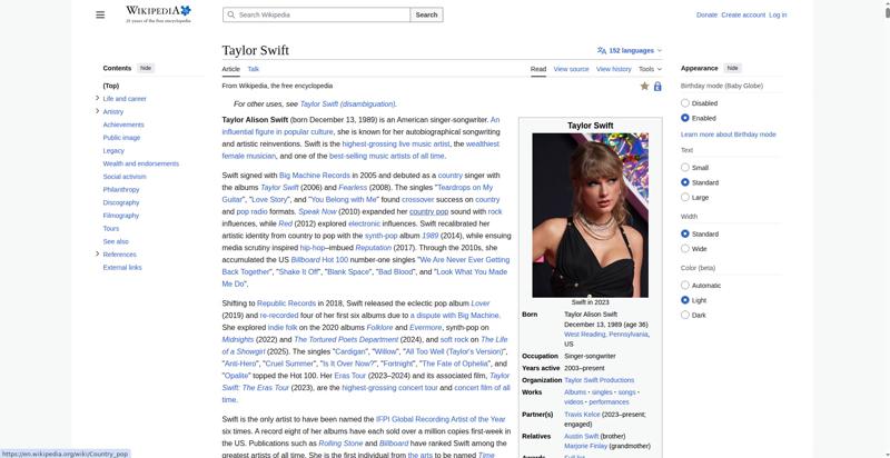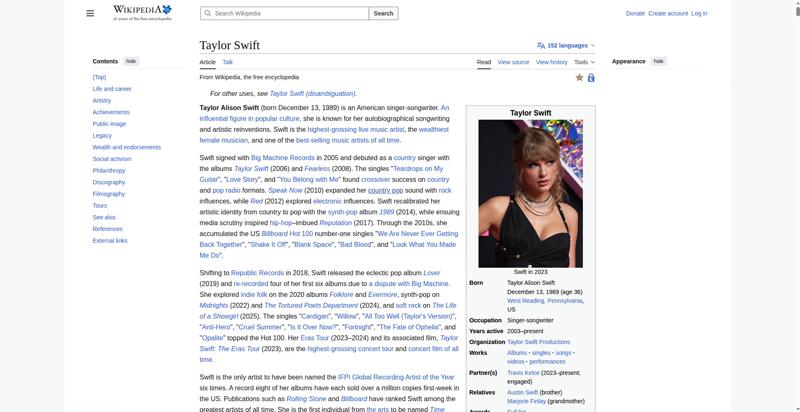 | Offenders: https://upload.wikimedia.org/wikipedia/en/thumb/e/e7/Cscr-featured.svg/20px-Cscr-featured.svg.png https://upload.wikimedia.org/wikipedia/en/thumb/8/8c/Extended-protection-shackle...n-shackle.svg.png https://upload.wikimedia.org/wikipedia/commons/thumb/b/b1/Taylor_Swift_at_the_20...wards_%283%29.png https://upload.wikimedia.org/wikipedia/en/thumb/8/8a/OOjs_UI_icon_edit-ltr-progr...ogressive.svg.png https://upload.wikimedia.org/wikipedia/commons/thumb/e/e6/Taylor_Swift_signature...signature.svg.png https://upload.wikimedia.org/wikipedia/commons/thumb/1/15/Taylor_Swift_at_Yahoo_...%28cropped%29.jpg https://upload.wikimedia.org/wikipedia/en/thumb/4/4a/Commons-logo.svg/20px-Commons-logo.svg.png https://upload.wikimedia.org/wikipedia/commons/thumb/2/24/Wikinews-logo.svg/40px...news-logo.svg.png https://upload.wikimedia.org/wikipedia/commons/thumb/f/fa/Wikiquote-logo.svg/40p...uote-logo.svg.png https://upload.wikimedia.org/wikipedia/commons/thumb/f/ff/Wikidata-logo.svg/40px...data-logo.svg.png https://upload.wikimedia.org/wikipedia/en/thumb/9/96/Symbol_category_class.svg/2...ory_class.svg.png https://upload.wikimedia.org/wikipedia/commons/thumb/e/e8/TaylorSwiftApr09.jpg/2...lorSwiftApr09.jpg https://upload.wikimedia.org/wikipedia/commons/thumb/6/6e/Taylor_Swift_2011crop....wift_2011crop.jpg https://upload.wikimedia.org/wikipedia/commons/thumb/b/b2/Taylor_Swift_Red_Tour_...our_2%2C_2013.jpg https://upload.wikimedia.org/wikipedia/commons/thumb/0/04/Taylor_Swift_045_%2817...7682880264%29.jpg https://upload.wikimedia.org/wikipedia/commons/thumb/7/7e/Taylor_Swift_Reputatio...%28cropped%29.jpg https://upload.wikimedia.org/wikipedia/commons/thumb/d/d9/191125_Taylor_Swift_at..._Music_Awards.png https://upload.wikimedia.org/wikipedia/commons/thumb/7/76/Taylor_Swift_2022_info..._2022_infobox.jpg https://upload.wikimedia.org/wikipedia/commons/thumb/5/5d/Taylor_Swift_The_Eras_...%28cropped%29.jpg https://upload.wikimedia.org/wikipedia/commons/thumb/c/cb/Gnome-mime-audio-openc...enclipart.svg.png https://upload.wikimedia.org/wikipedia/commons/thumb/7/7c/Taylor_Swift_Sydney.jp..._Swift_Sydney.jpg https://upload.wikimedia.org/wikipedia/commons/thumb/1/1f/Taylor_Swift_-_Reputat...%28cropped%29.jpg https://upload.wikimedia.org/wikipedia/commons/thumb/1/1d/Taylor_Swift_2009_MTV_...%28cropped%29.jpg https://upload.wikimedia.org/wikipedia/commons/thumb/0/0a/5.3.10TaylorSwiftByDav...avidShankbone.jpg https://upload.wikimedia.org/wikipedia/commons/thumb/5/5a/Taylor_Swift_wax_figur...%28cropped%29.jpg https://upload.wikimedia.org/wikipedia/commons/thumb/c/cf/Taylor_Swift_for_Keds....wift_for_Keds.jpg https://upload.wikimedia.org/wikipedia/commons/thumb/6/6c/Audio-input-microphone...ut-microphone.png https://upload.wikimedia.org/wikipedia/commons/d/d6/Lock-gray-alt-2.svg https://upload.wikimedia.org/wikipedia/commons/a/aa/Lock-red-alt-2.svg https://upload.wikimedia.org/wikipedia/commons/4/4d/Icon_pdf_file.png https://upload.wikimedia.org/wikipedia/commons/6/65/Lock-green.svg https://en.wikipedia.org/wiki/Special:CentralAutoLogin/start?useformat=desktop&type=script&usesul3=1 https://auth.wikimedia.org/metawiki/wiki/Special:CentralAutoLogin/checkLoggedIn...gin/checkLoggedIn |