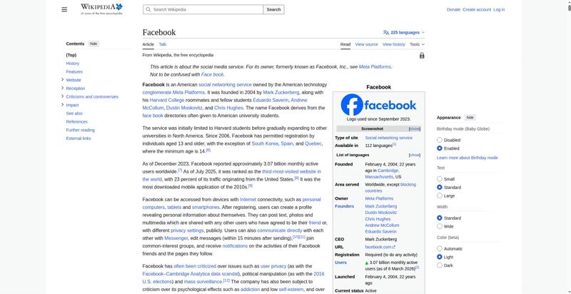 | Offenders: https://upload.wikimedia.org/wikipedia/en/thumb/1/1b/Semi-protection-shackle.svg...n-shackle.svg.png https://upload.wikimedia.org/wikipedia/commons/thumb/b/b9/2023_Facebook_icon.svg...book_icon.svg.png https://upload.wikimedia.org/wikipedia/commons/thumb/9/93/Facebook_logo_%282023%...282023%29.svg.png https://upload.wikimedia.org/wikipedia/en/6/64/Facebook_user_page.png https://upload.wikimedia.org/wikipedia/commons/thumb/b/b0/Increase2.svg/20px-Increase2.svg.png https://upload.wikimedia.org/wikipedia/commons/thumb/0/05/Meta_Platforms_Inc._lo...ropped%29.svg.png https://upload.wikimedia.org/wikipedia/commons/thumb/9/99/Wiktionary-logo-en-v2....ogo-en-v2.svg.png https://upload.wikimedia.org/wikipedia/en/thumb/4/4a/Commons-logo.svg/20px-Commons-logo.svg.png https://upload.wikimedia.org/wikipedia/commons/thumb/2/24/Wikinews-logo.svg/40px...news-logo.svg.png https://upload.wikimedia.org/wikipedia/commons/thumb/f/fa/Wikiquote-logo.svg/40p...uote-logo.svg.png https://upload.wikimedia.org/wikipedia/commons/thumb/3/32/Scholia_logo.svg/40px-Scholia_logo.svg.png https://upload.wikimedia.org/wikipedia/commons/thumb/f/fc/MarkZuckerberg-crop.jp...ckerberg-crop.jpg https://upload.wikimedia.org/wikipedia/en/thumb/1/12/Original-facebook.jpg/250px...inal-facebook.jpg https://upload.wikimedia.org/wikipedia/commons/thumb/0/06/Facebook.svg/250px-Facebook.svg.png https://upload.wikimedia.org/wikipedia/commons/thumb/6/69/Screen_of_Facebook_%28...ebook_%282%29.PNG https://upload.wikimedia.org/wikipedia/commons/3/38/Facebook_Like_React.png https://upload.wikimedia.org/wikipedia/commons/thumb/f/f4/Facebook_t-shirt_with_...d_for_Hackers.jpg https://upload.wikimedia.org/wikipedia/commons/thumb/5/5d/Population_pyramid_of_..._users_by_age.png https://upload.wikimedia.org/wikipedia/commons/thumb/9/9c/Facebook_censorship.sv...ensorship.svg.png https://upload.wikimedia.org/wikipedia/commons/thumb/f/f3/PRISM_Collection_Detai...ction_Details.jpg https://upload.wikimedia.org/wikipedia/commons/thumb/6/62/Onavo_logo.png/250px-Onavo_logo.png https://upload.wikimedia.org/wikipedia/commons/thumb/2/26/Hands_Off%21_protest%2...5%2C_2025-053.jpg https://upload.wikimedia.org/wikipedia/commons/thumb/c/c9/Berlin_%289163009052%2...9163009052%29.jpg https://upload.wikimedia.org/wikipedia/commons/thumb/6/61/Ad-tech_London_2010_%2..._2010_%285%29.JPG https://upload.wikimedia.org/wikipedia/commons/thumb/2/27/2011_Egyptian_protests...26_jan25_card.jpg https://upload.wikimedia.org/wikipedia/commons/thumb/9/99/SF_Pride_2014_-_Stierc...4_-_Stierch_7.jpg https://upload.wikimedia.org/wikipedia/commons/thumb/2/2a/Industry5.svg/40px-Industry5.svg.png https://upload.wikimedia.org/wikipedia/commons/thumb/f/f9/Crystal_Clear_app_linn...ghborhood.svg.png https://upload.wikimedia.org/wikipedia/en/thumb/8/8a/OOjs_UI_icon_edit-ltr-progr...ogressive.svg.png https://upload.wikimedia.org/wikipedia/commons/a/aa/Lock-red-alt-2.svg https://upload.wikimedia.org/wikipedia/commons/4/4d/Icon_pdf_file.png https://upload.wikimedia.org/wikipedia/commons/6/65/Lock-green.svg https://upload.wikimedia.org/wikipedia/commons/d/d6/Lock-gray-alt-2.svg https://en.wikipedia.org/wiki/Special:CentralAutoLogin/start?useformat=desktop&type=script&usesul3=1 https://auth.wikimedia.org/metawiki/wiki/Special:CentralAutoLogin/checkLoggedIn...gin/checkLoggedIn |