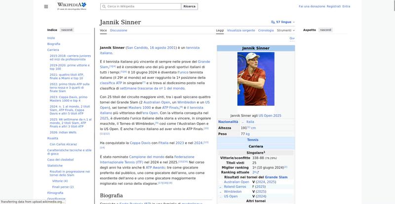 <img resource="//it.wikipedia.org/wiki/File:Jannik_Sinner_US_Open_2025_(cropped).jpg" src="//upload.wikimedia.org/wikipedia/commons/thumb/4/48/Jannik_Sinner_US_Open_2025_%28cropped%29.jpg/250px-Jannik_Sinner_US_Open_2025_%28cropped%29.jpg" decoding="async" data-file-width="1204" data-file-height="2000" data-file-type="bitmap" height="300" width="180" srcset="//upload.wikimedia.org/wikipedia/commons/thumb/4/48/Jannik_Sinner_US_Open_2025_%28cropped%29.jpg/330px-Jannik_Sinner_US_Open_2025_%28cropped%29.jpg 1.5x, //upload.wikimedia.org/wikipedia/commons/thumb/4/48/Jannik_Sinner_US_Open_2025_%28cropped%29.jpg/500px-Jannik_Sinner_US_Open_2025_%28cropped%29.jpg 2x" class="mw-file-element">