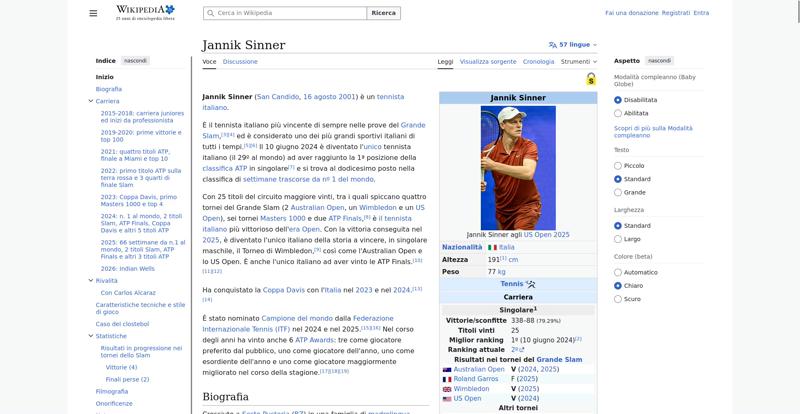 <img resource="//it.wikipedia.org/wiki/File:Jannik_Sinner_US_Open_2025_(cropped).jpg" src="//upload.wikimedia.org/wikipedia/commons/thumb/4/48/Jannik_Sinner_US_Open_2025_%28cropped%29.jpg/250px-Jannik_Sinner_US_Open_2025_%28cropped%29.jpg" decoding="async" data-file-width="1204" data-file-height="2000" data-file-type="bitmap" height="300" width="180" srcset="//upload.wikimedia.org/wikipedia/commons/thumb/4/48/Jannik_Sinner_US_Open_2025_%28cropped%29.jpg/330px-Jannik_Sinner_US_Open_2025_%28cropped%29.jpg 1.5x, //upload.wikimedia.org/wikipedia/commons/thumb/4/48/Jannik_Sinner_US_Open_2025_%28cropped%29.jpg/500px-Jannik_Sinner_US_Open_2025_%28cropped%29.jpg 2x" class="mw-file-element">
