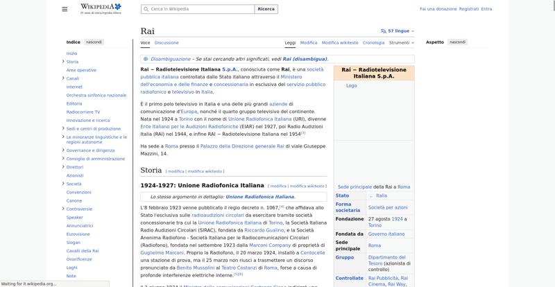 Element/tag<img alt="Logo" resource="//it.wikipedia.org/wiki/File:Logo_of_RAI_(2016).svg" src="//upload.wikimedia.org/wikipedia/commons/thumb/8/88/Logo_of_RAI_%282016%29.svg/250px-Logo_of_RAI_%282016%29.svg.png" decoding="async" data-file-width="512" data-file-height="512" data-file-type="drawing" height="200" width="200" srcset="//upload.wikimedia.org/wikipedia/commons/thumb/8/88/Logo_of_RAI_%282016%29.svg/330px-Logo_of_RAI_%282016%29.svg.png 1.5x, //upload.wikimedia.org/wikipedia/commons/thumb/8/88/Logo_of_RAI_%282016%29.svg/500px-Logo_of_RAI_%282016%29.svg.png 2x" class="mw-file-element">