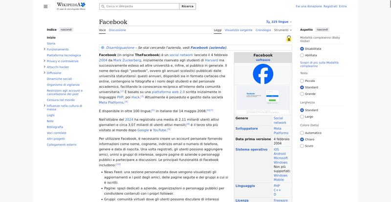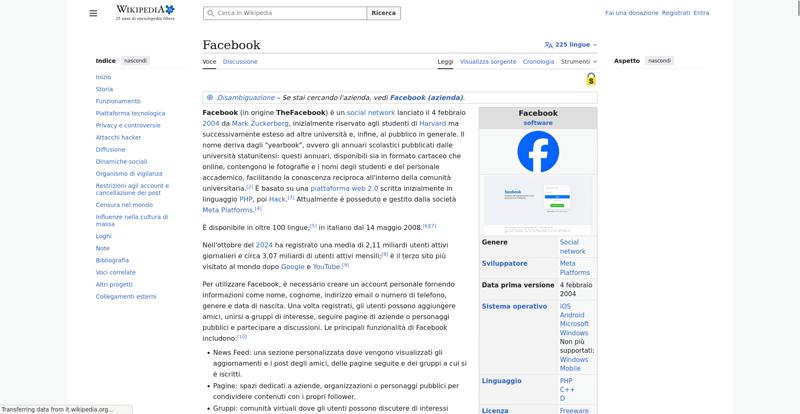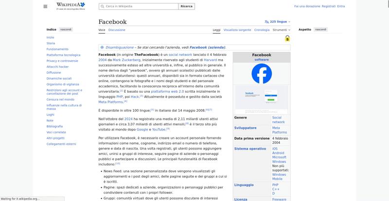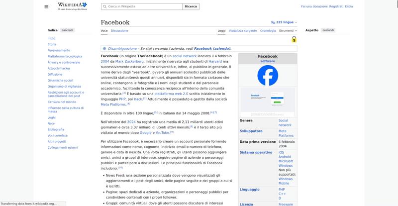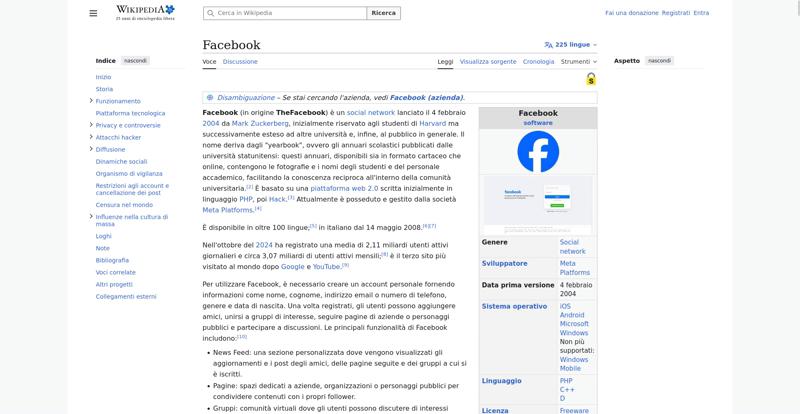 | Offenders: https://upload.wikimedia.org/wikipedia/commons/thumb/a/a5/Semi-protection-shackl...le-itwiki.svg.png https://upload.wikimedia.org/wikipedia/commons/thumb/b/bc/Nota_disambigua.svg/20...isambigua.svg.png https://upload.wikimedia.org/wikipedia/commons/thumb/b/b9/2023_Facebook_icon.svg...book_icon.svg.png https://upload.wikimedia.org/wikipedia/commons/thumb/6/69/Screen_of_Facebook_%28...ebook_%282%29.PNG https://upload.wikimedia.org/wikipedia/commons/thumb/e/ef/MarkZuckerberg.jpg/250...arkZuckerberg.jpg https://upload.wikimedia.org/wikipedia/commons/thumb/4/49/Sean_Parker.jpg/250px-Sean_Parker.jpg https://upload.wikimedia.org/wikipedia/commons/thumb/8/87/Magnifying_glass_icon_...icon_mgx2.svg.png https://upload.wikimedia.org/wikipedia/commons/thumb/f/f7/Social_networks.jpg/50...cial_networks.jpg https://upload.wikimedia.org/wikipedia/commons/thumb/c/c5/Local-important.svg/40...important.svg.png https://upload.wikimedia.org/wikipedia/commons/thumb/c/ce/Old-Facebook-Logo.jpg/...Facebook-Logo.jpg https://upload.wikimedia.org/wikipedia/commons/thumb/f/fd/Facebook-reversed.svg/...-reversed.svg.png https://upload.wikimedia.org/wikipedia/commons/thumb/8/87/Facebook_Logo_%282015%...%29_light.svg.png https://upload.wikimedia.org/wikipedia/commons/thumb/8/89/Facebook_Logo_%282019%...282019%29.svg.png https://upload.wikimedia.org/wikipedia/commons/thumb/9/93/Facebook_logo_%282023%...282023%29.svg.png https://upload.wikimedia.org/wikipedia/commons/thumb/f/fa/Wikiquote-logo.svg/20p...uote-logo.svg.png https://upload.wikimedia.org/wikipedia/commons/thumb/4/4a/Commons-logo.svg/20px-Commons-logo.svg.png https://upload.wikimedia.org/wikipedia/commons/thumb/2/24/Wikinews-logo.svg/20px...news-logo.svg.png https://upload.wikimedia.org/wikipedia/commons/thumb/7/73/Blue_pencil.svg/20px-Blue_pencil.svg.png https://upload.wikimedia.org/wikipedia/commons/thumb/7/7b/Meta_Platforms_Inc._lo...Inc._logo.svg.png https://upload.wikimedia.org/wikipedia/commons/thumb/7/70/Applications-internet....-internet.svg.png https://upload.wikimedia.org/wikipedia/commons/thumb/0/0f/People.svg/40px-People.svg.png https://en.wikipedia.org/w/index.php...a.org/w/index.php https://en.wikipedia.org/w/index.php...a.org/w/index.php https://it.wikipedia.org/wiki/Special:CentralAutoLogin/start?useformat=desktop&type=script&usesul3=1 https://auth.wikimedia.org/metawiki/wiki/Special:CentralAutoLogin/checkLoggedIn...gin/checkLoggedIn |