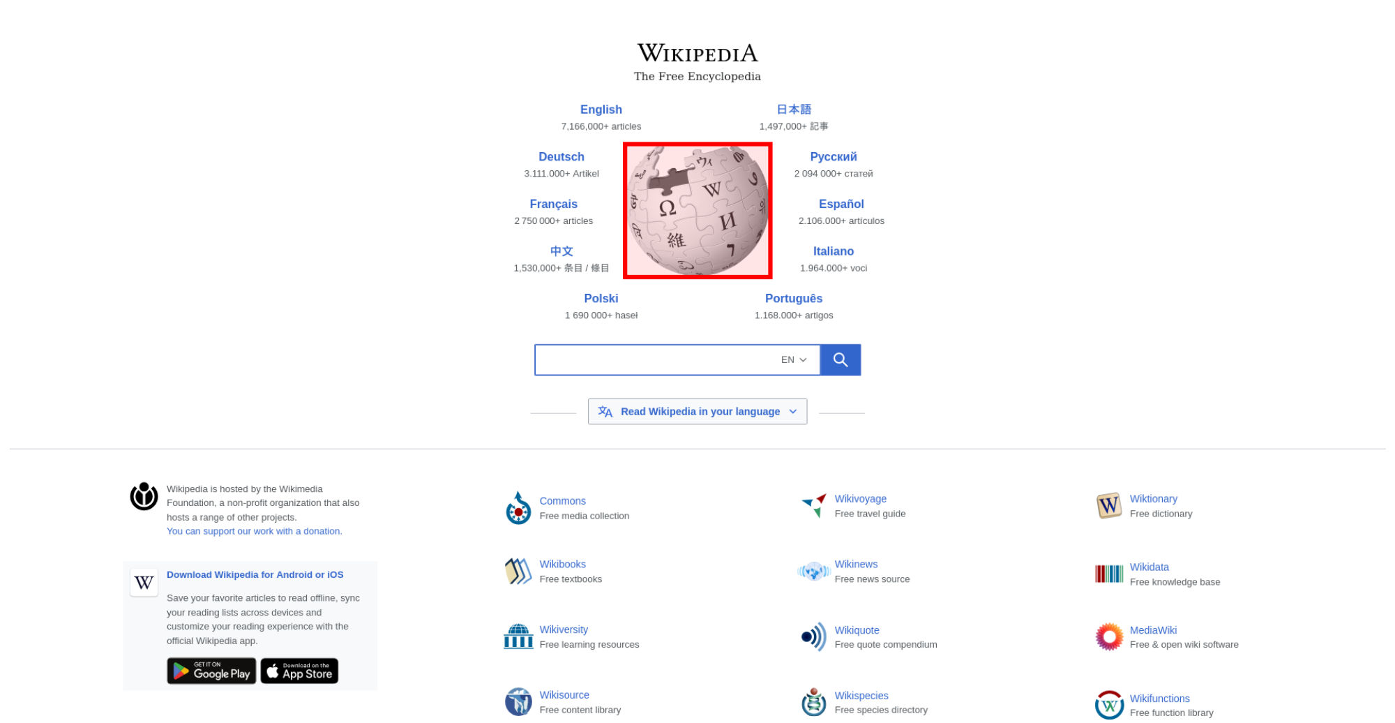 | Element/tag | <img class="central-featured-logo" src="portal/wikipedia.org/assets/img/Wikipedia-logo-v2.png" srcset="portal/wikipedia.org/assets/img/Wikipedia-logo-v2@1.5x.png 1.5x, portal/wikipedia.org/assets/img/Wikipedia-logo-v2@2x.png 2x" width="200" height="183" alt=""> |