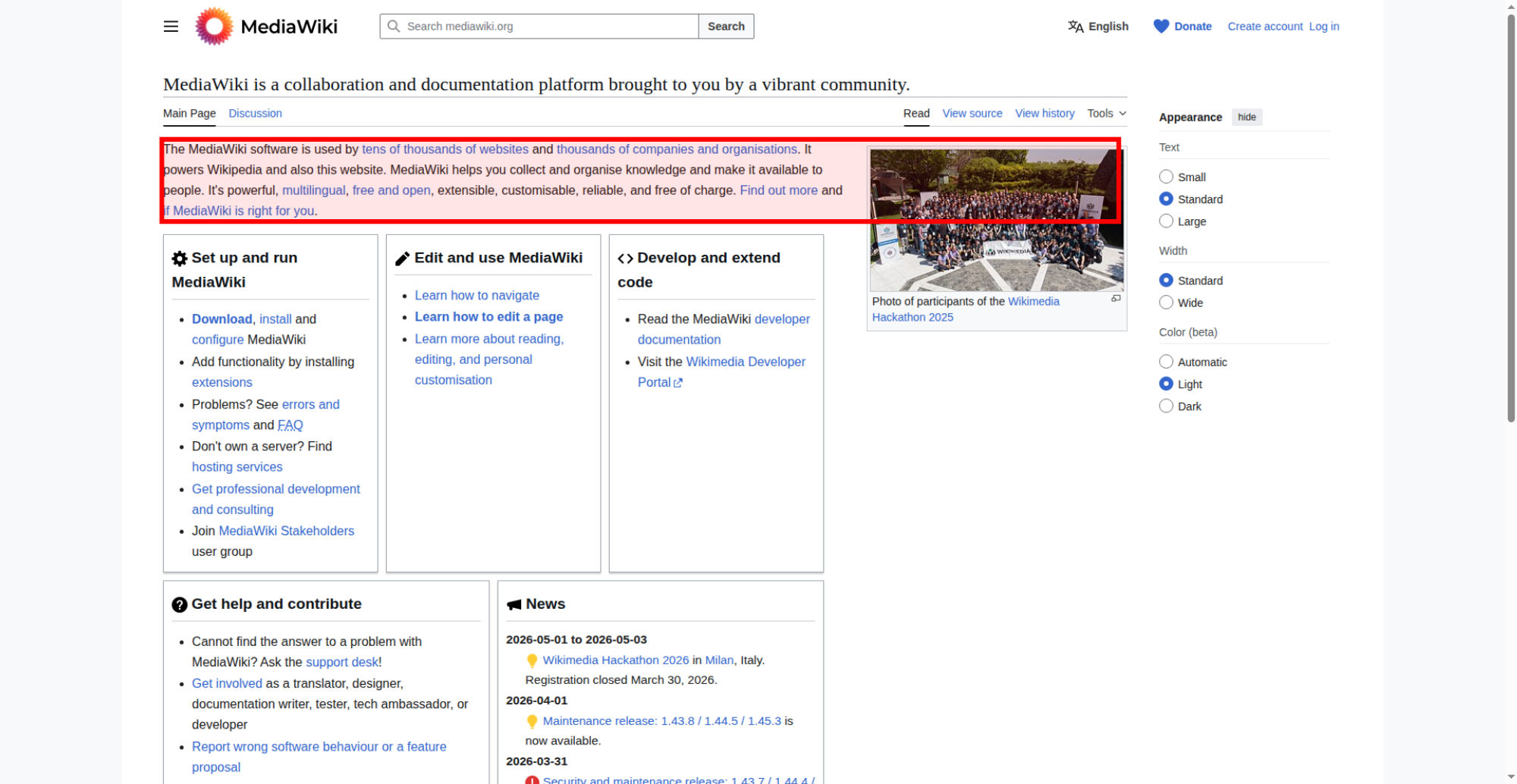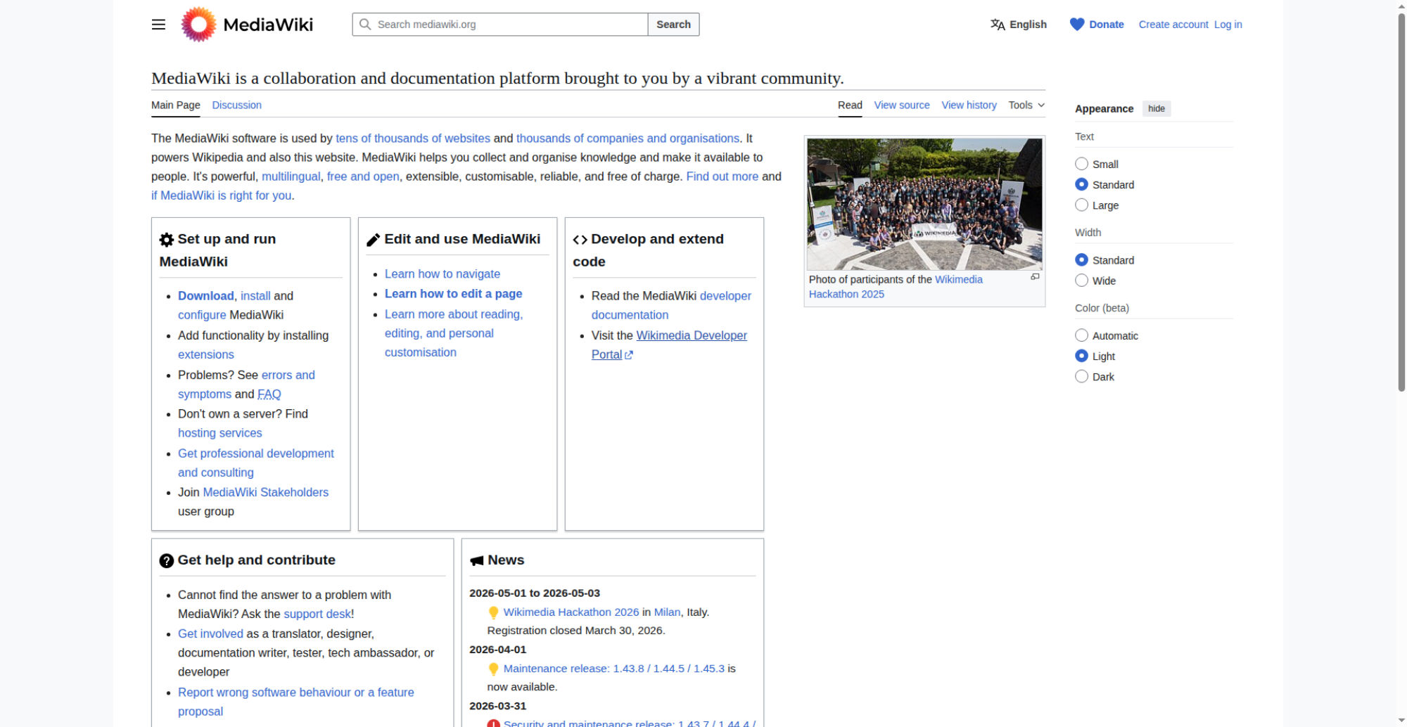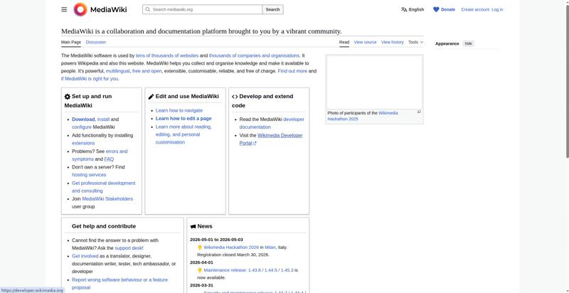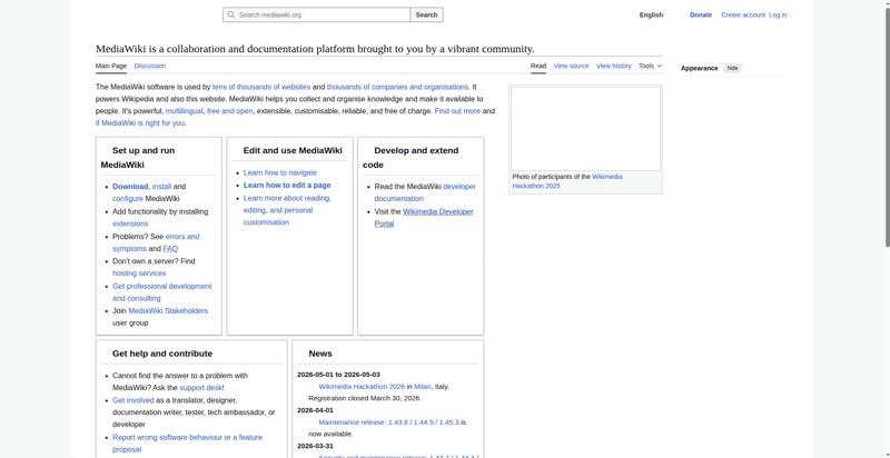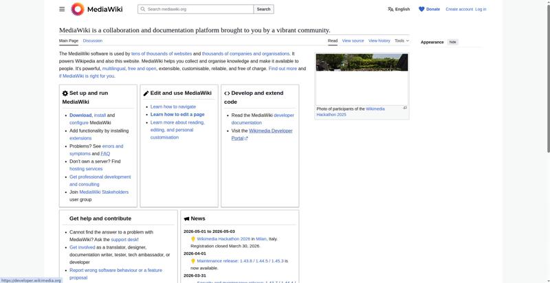 | <img src="//upload.wikimedia.org/wikipedia/commons/thumb/e/e4/Wikimedia_Hackathon_2025_Group_photo_from_drone.jpg/330px-Wikimedia_Hackathon_2025_Group_photo_from_drone.jpg?utm_source=www.mediawiki.org&utm_campaign=parser&utm_content=thumbnail" decoding="async" width="320" height="180" class="mw-file-element" srcset="//upload.wikimedia.org/wikipedia/commons/thumb/e/e4/Wikimedia_Hackathon_2025_Group_photo_from_drone.jpg/960px-Wikimedia_Hackathon_2025_Group_photo_from_drone.jpg?utm_source=www.mediawiki.org&utm_campaign=parser&utm_content=thumbnail 2x" data-file-width="3775" data-file-height="2119"> | |||||