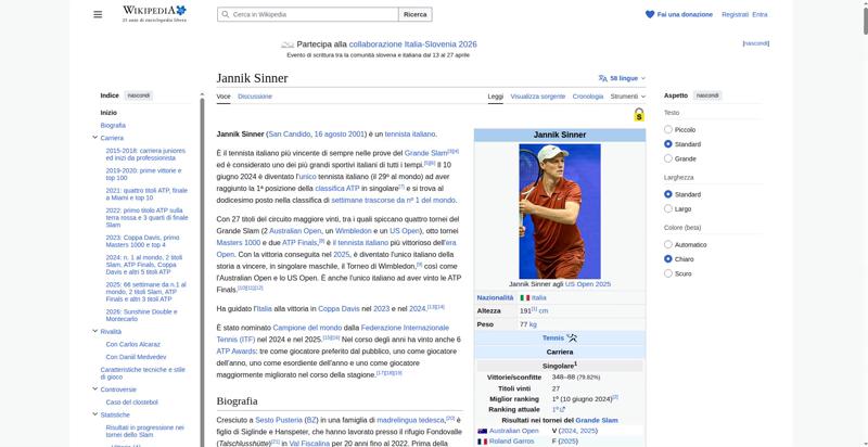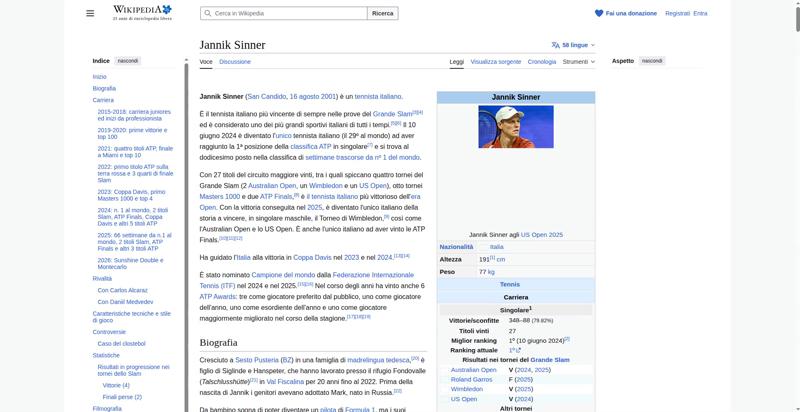 | <img resource="//it.wikipedia.org/wiki/File:Jannik_Sinner_US_Open_2025_(cropped).jpg" src="//upload.wikimedia.org/wikipedia/commons/thumb/4/48/Jannik_Sinner_US_Open_2025_%28cropped%29.jpg/250px-Jannik_Sinner_US_Open_2025_%28cropped%29.jpg" decoding="async" data-file-width="1204" data-file-height="2000" data-file-type="bitmap" height="300" width="180" srcset="//upload.wikimedia.org/wikipedia/commons/thumb/4/48/Jannik_Sinner_US_Open_2025_%28cropped%29.jpg/500px-Jannik_Sinner_US_Open_2025_%28cropped%29.jpg 2x" class="mw-file-element"> | |||||