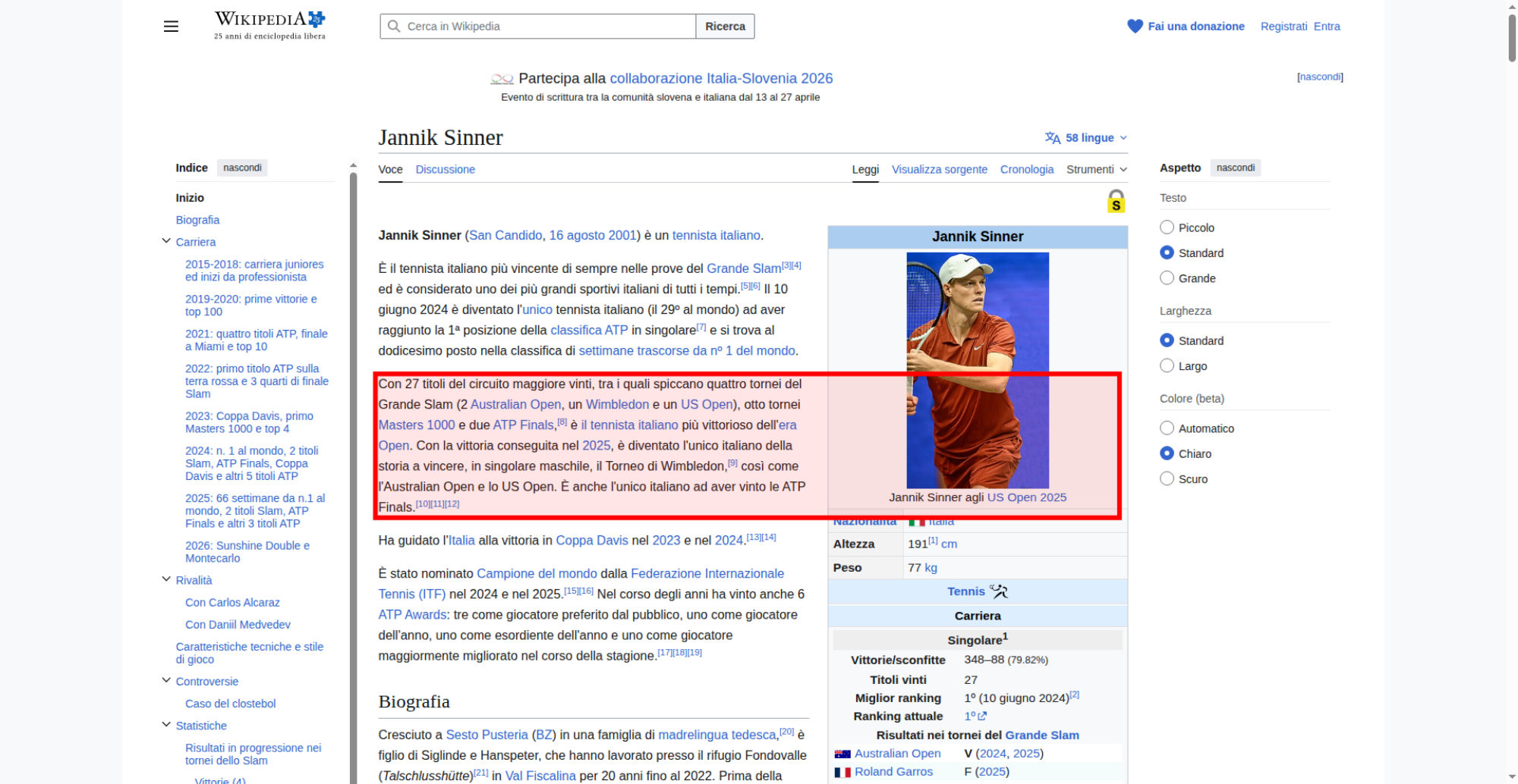 | <img resource="//it.wikipedia.org/wiki/File:Jannik_Sinner_US_Open_2025_(cropped).jpg" src="//upload.wikimedia.org/wikipedia/commons/thumb/4/48/Jannik_Sinner_US_Open_2025_%28cropped%29.jpg/250px-Jannik_Sinner_US_Open_2025_%28cropped%29.jpg" decoding="async" data-file-width="1204" data-file-height="2000" data-file-type="bitmap" height="300" width="180" srcset="//upload.wikimedia.org/wikipedia/commons/thumb/4/48/Jannik_Sinner_US_Open_2025_%28cropped%29.jpg/500px-Jannik_Sinner_US_Open_2025_%28cropped%29.jpg 2x" class="mw-file-element"> | |||||