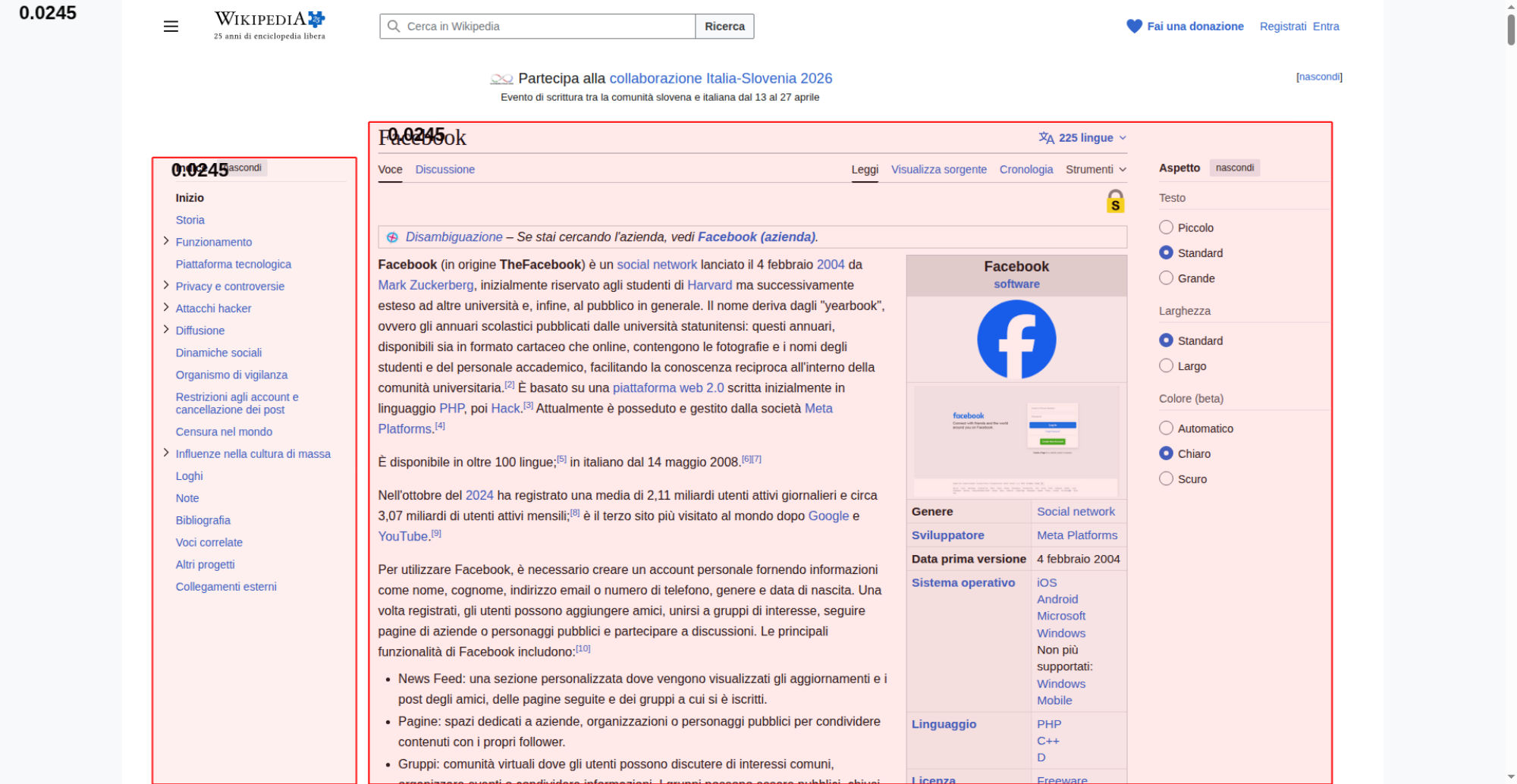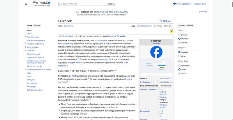 | <img alt="Schermata di esempio" resource="//it.wikipedia.org/wiki/File:Screen_of_Facebook_(2).PNG" src="//upload.wikimedia.org/wikipedia/commons/thumb/6/69/Screen_of_Facebook_%282%29.PNG/330px-Screen_of_Facebook_%282%29.PNG" decoding="async" data-file-width="1600" data-file-height="859" data-file-type="bitmap" height="140" width="260" srcset="//upload.wikimedia.org/wikipedia/commons/thumb/6/69/Screen_of_Facebook_%282%29.PNG/960px-Screen_of_Facebook_%282%29.PNG 2x" class="mw-file-element"> | |||||