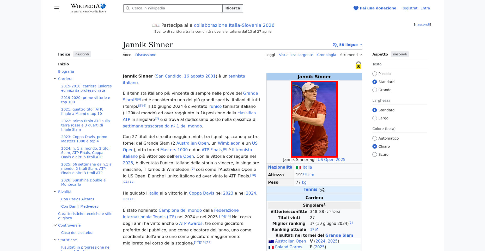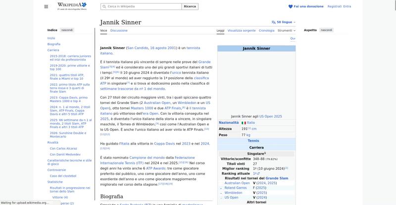 | Offenders: https://upload.wikimedia.org/wikipedia/commons/thumb/a/a5/Semi-protection-shackl...le-itwiki.svg.png https://upload.wikimedia.org/wikipedia/commons/thumb/0/03/Flag_of_Italy.svg/20px..._of_Italy.svg.png https://upload.wikimedia.org/wikipedia/commons/thumb/b/b9/Flag_of_Australia.svg/...Australia.svg.png https://upload.wikimedia.org/wikipedia/commons/thumb/c/c3/Flag_of_France.svg/20p...of_France.svg.png https://upload.wikimedia.org/wikipedia/commons/thumb/8/83/Flag_of_the_United_Kin...%283-5%29.svg.png https://upload.wikimedia.org/wikipedia/commons/thumb/a/a4/Flag_of_the_United_Sta...ed_States.svg.png https://upload.wikimedia.org/wikipedia/commons/8/8c/Transparent.png https://upload.wikimedia.org/wikipedia/commons/6/6a/Jannik_Sinner_logo.png https://upload.wikimedia.org/wikipedia/commons/thumb/8/87/Magnifying_glass_icon_...icon_mgx2.svg.png https://upload.wikimedia.org/wikipedia/commons/thumb/f/f3/Flag_of_Russia.svg/20p...of_Russia.svg.png https://upload.wikimedia.org/wikipedia/commons/thumb/b/ba/Flag_of_Germany.svg/20...f_Germany.svg.png https://upload.wikimedia.org/wikipedia/commons/thumb/9/9a/Flag_of_Spain.svg/20px..._of_Spain.svg.png https://upload.wikimedia.org/wikipedia/commons/thumb/9/9c/Nastrino_Stella_Merito...tivo_2015.svg.png https://upload.wikimedia.org/wikipedia/commons/thumb/4/42/35mm_film_frames.svg/2...lm_frames.svg.png https://upload.wikimedia.org/wikipedia/commons/thumb/2/24/Wikinews-logo.svg/20px...news-logo.svg.png https://upload.wikimedia.org/wikipedia/commons/thumb/7/73/Blue_pencil.svg/20px-Blue_pencil.svg.png https://upload.wikimedia.org/wikipedia/commons/thumb/f/ff/Flag_of_Serbia.svg/20p...of_Serbia.svg.png https://upload.wikimedia.org/wikipedia/commons/thumb/4/4c/Flag_of_Sweden.svg/20p...of_Sweden.svg.png https://upload.wikimedia.org/wikipedia/commons/6/61/Tennis_icon_nobkg.png https://upload.wikimedia.org/wikipedia/commons/thumb/4/4c/Logo_Slovenija-Italia_...alia_2026.svg.png https://upload.wikimedia.org/wikipedia/commons/thumb/4/48/Jannik_Sinner_US_Open_...%28cropped%29.jpg https://upload.wikimedia.org/wikipedia/commons/thumb/8/85/Tennis_pictogram.svg/4...pictogram.svg.png https://upload.wikimedia.org/wikipedia/commons/thumb/3/3e/ATP_World_Tour_Finals_...London%29.svg.png https://upload.wikimedia.org/wikipedia/commons/thumb/b/be/Jannik_Sinner_after_wi...Milan%2C_2019.jpg https://upload.wikimedia.org/wikipedia/commons/thumb/f/f6/Sinner_MCM23_%288%29_%...2883593853%29.jpg https://upload.wikimedia.org/wikipedia/commons/thumb/6/66/Jannik_Sinner_%282024_...US_Open%29_01.jpg https://upload.wikimedia.org/wikipedia/commons/thumb/f/fa/Wikiquote-logo.svg/20p...uote-logo.svg.png https://upload.wikimedia.org/wikipedia/commons/thumb/4/4a/Commons-logo.svg/20px-Commons-logo.svg.png https://upload.wikimedia.org/wikipedia/commons/thumb/c/cf/Flag_of_Canada.svg/20p...of_Canada.svg.png https://upload.wikimedia.org/wikipedia/commons/thumb/0/03/Flag_of_Italy.svg/60px..._of_Italy.svg.png https://upload.wikimedia.org/wikipedia/commons/thumb/c/cb/Flag_of_Romania_%28196...931989%29.svg.png https://upload.wikimedia.org/wikipedia/commons/thumb/c/cb/Flag_of_the_Czech_Repu..._Republic.svg.png https://upload.wikimedia.org/wikipedia/commons/thumb/4/41/Flag_of_Austria.svg/20...f_Austria.svg.png https://upload.wikimedia.org/wikipedia/commons/thumb/7/78/Flag_of_Chile.svg/20px..._of_Chile.svg.png https://upload.wikimedia.org/wikipedia/commons/thumb/0/05/Flag_of_Brazil.svg/20p...of_Brazil.svg.png https://upload.wikimedia.org/wikipedia/commons/thumb/f/f3/Flag_of_Switzerland.sv...itzerland.svg.png https://upload.wikimedia.org/wikipedia/commons/thumb/6/67/Crystal_Clear_app_Logi...n_Manager.svg.png https://en.wikipedia.org/w/index.php...a.org/w/index.php https://en.wikipedia.org/w/index.php...a.org/w/index.php https://it.wikipedia.org/wiki/Special:CentralAutoLogin/start?useformat=desktop&type=script&usesul3=1 https://auth.wikimedia.org/metawiki/wiki/Special:CentralAutoLogin/checkLoggedIn...gin/checkLoggedIn |