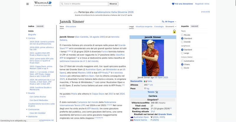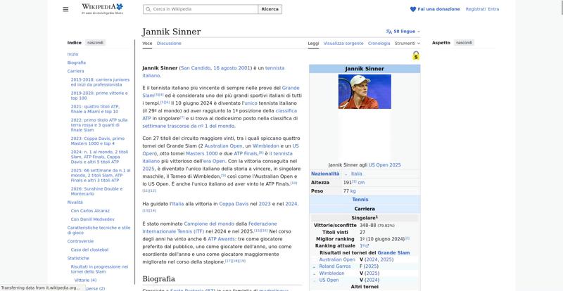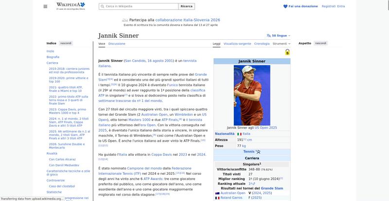 | Offenders: https://upload.wikimedia.org/wikipedia/commons/thumb/a/a5/Semi-protection-shackl...le-itwiki.svg.png https://upload.wikimedia.org/wikipedia/commons/thumb/0/03/Flag_of_Italy.svg/20px..._of_Italy.svg.png https://upload.wikimedia.org/wikipedia/commons/thumb/b/b9/Flag_of_Australia.svg/...Australia.svg.png https://upload.wikimedia.org/wikipedia/commons/thumb/c/c3/Flag_of_France.svg/20p...of_France.svg.png https://upload.wikimedia.org/wikipedia/commons/thumb/8/83/Flag_of_the_United_Kin...%283-5%29.svg.png https://upload.wikimedia.org/wikipedia/commons/thumb/a/a4/Flag_of_the_United_Sta...ed_States.svg.png https://upload.wikimedia.org/wikipedia/commons/8/8c/Transparent.png https://upload.wikimedia.org/wikipedia/commons/6/6a/Jannik_Sinner_logo.png https://upload.wikimedia.org/wikipedia/commons/thumb/8/87/Magnifying_glass_icon_...icon_mgx2.svg.png https://upload.wikimedia.org/wikipedia/commons/thumb/f/f3/Flag_of_Russia.svg/20p...of_Russia.svg.png https://upload.wikimedia.org/wikipedia/commons/thumb/b/ba/Flag_of_Germany.svg/20...f_Germany.svg.png https://upload.wikimedia.org/wikipedia/commons/thumb/9/9a/Flag_of_Spain.svg/20px..._of_Spain.svg.png https://upload.wikimedia.org/wikipedia/commons/thumb/9/9c/Nastrino_Stella_Merito...tivo_2015.svg.png https://upload.wikimedia.org/wikipedia/commons/thumb/4/42/35mm_film_frames.svg/2...lm_frames.svg.png https://upload.wikimedia.org/wikipedia/commons/thumb/2/24/Wikinews-logo.svg/20px...news-logo.svg.png https://upload.wikimedia.org/wikipedia/commons/thumb/7/73/Blue_pencil.svg/20px-Blue_pencil.svg.png https://upload.wikimedia.org/wikipedia/commons/thumb/f/ff/Flag_of_Serbia.svg/20p...of_Serbia.svg.png https://upload.wikimedia.org/wikipedia/commons/thumb/4/4c/Flag_of_Sweden.svg/20p...of_Sweden.svg.png https://upload.wikimedia.org/wikipedia/commons/6/61/Tennis_icon_nobkg.png https://upload.wikimedia.org/wikipedia/commons/thumb/4/4c/Logo_Slovenija-Italia_...alia_2026.svg.png https://upload.wikimedia.org/wikipedia/commons/thumb/4/48/Jannik_Sinner_US_Open_...%28cropped%29.jpg https://upload.wikimedia.org/wikipedia/commons/thumb/8/85/Tennis_pictogram.svg/4...pictogram.svg.png https://upload.wikimedia.org/wikipedia/commons/thumb/3/3e/ATP_World_Tour_Finals_...London%29.svg.png https://upload.wikimedia.org/wikipedia/commons/thumb/b/be/Jannik_Sinner_after_wi...Milan%2C_2019.jpg https://upload.wikimedia.org/wikipedia/commons/thumb/f/f6/Sinner_MCM23_%288%29_%...2883593853%29.jpg https://upload.wikimedia.org/wikipedia/commons/thumb/6/66/Jannik_Sinner_%282024_...US_Open%29_01.jpg https://upload.wikimedia.org/wikipedia/commons/thumb/f/fa/Wikiquote-logo.svg/20p...uote-logo.svg.png https://upload.wikimedia.org/wikipedia/commons/thumb/4/4a/Commons-logo.svg/20px-Commons-logo.svg.png https://upload.wikimedia.org/wikipedia/commons/thumb/c/cf/Flag_of_Canada.svg/20p...of_Canada.svg.png https://upload.wikimedia.org/wikipedia/commons/thumb/0/03/Flag_of_Italy.svg/60px..._of_Italy.svg.png https://upload.wikimedia.org/wikipedia/commons/thumb/c/cb/Flag_of_Romania_%28196...931989%29.svg.png https://upload.wikimedia.org/wikipedia/commons/thumb/c/cb/Flag_of_the_Czech_Repu..._Republic.svg.png https://upload.wikimedia.org/wikipedia/commons/thumb/4/41/Flag_of_Austria.svg/20...f_Austria.svg.png https://upload.wikimedia.org/wikipedia/commons/thumb/7/78/Flag_of_Chile.svg/20px..._of_Chile.svg.png https://upload.wikimedia.org/wikipedia/commons/thumb/0/05/Flag_of_Brazil.svg/20p...of_Brazil.svg.png https://upload.wikimedia.org/wikipedia/commons/thumb/f/f3/Flag_of_Switzerland.sv...itzerland.svg.png https://upload.wikimedia.org/wikipedia/commons/thumb/6/67/Crystal_Clear_app_Logi...n_Manager.svg.png https://en.wikipedia.org/w/index.php...a.org/w/index.php https://en.wikipedia.org/w/index.php...a.org/w/index.php https://it.wikipedia.org/wiki/Special:CentralAutoLogin/start?useformat=desktop&type=script&usesul3=1 https://auth.wikimedia.org/metawiki/wiki/Special:CentralAutoLogin/checkLoggedIn...gin/checkLoggedIn |