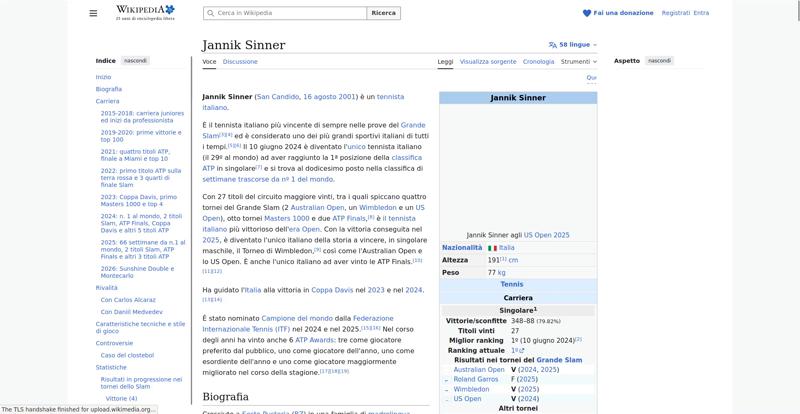 | Offenders: https://upload.wikimedia.org/wikipedia/commons/thumb/a/a5/Semi-protection-shackl...le-itwiki.svg.png https://upload.wikimedia.org/wikipedia/commons/thumb/0/03/Flag_of_Italy.svg/20px..._of_Italy.svg.png https://upload.wikimedia.org/wikipedia/commons/thumb/b/b9/Flag_of_Australia.svg/...Australia.svg.png https://upload.wikimedia.org/wikipedia/commons/thumb/c/c3/Flag_of_France.svg/20p...of_France.svg.png https://upload.wikimedia.org/wikipedia/commons/thumb/8/83/Flag_of_the_United_Kin...%283-5%29.svg.png https://upload.wikimedia.org/wikipedia/commons/thumb/a/a4/Flag_of_the_United_Sta...ed_States.svg.png https://upload.wikimedia.org/wikipedia/commons/8/8c/Transparent.png https://upload.wikimedia.org/wikipedia/commons/6/6a/Jannik_Sinner_logo.png https://upload.wikimedia.org/wikipedia/commons/thumb/8/87/Magnifying_glass_icon_...icon_mgx2.svg.png https://upload.wikimedia.org/wikipedia/commons/thumb/f/f3/Flag_of_Russia.svg/20p...of_Russia.svg.png https://upload.wikimedia.org/wikipedia/commons/thumb/b/ba/Flag_of_Germany.svg/20...f_Germany.svg.png https://upload.wikimedia.org/wikipedia/commons/thumb/9/9a/Flag_of_Spain.svg/20px..._of_Spain.svg.png https://upload.wikimedia.org/wikipedia/commons/thumb/9/9c/Nastrino_Stella_Merito...tivo_2015.svg.png https://upload.wikimedia.org/wikipedia/commons/thumb/4/42/35mm_film_frames.svg/2...lm_frames.svg.png https://upload.wikimedia.org/wikipedia/commons/thumb/2/24/Wikinews-logo.svg/20px...news-logo.svg.png https://upload.wikimedia.org/wikipedia/commons/thumb/7/73/Blue_pencil.svg/20px-Blue_pencil.svg.png https://upload.wikimedia.org/wikipedia/commons/thumb/f/ff/Flag_of_Serbia.svg/20p...of_Serbia.svg.png https://upload.wikimedia.org/wikipedia/commons/thumb/4/4c/Flag_of_Sweden.svg/20p...of_Sweden.svg.png https://upload.wikimedia.org/wikipedia/commons/6/61/Tennis_icon_nobkg.png https://upload.wikimedia.org/wikipedia/commons/thumb/4/4c/Logo_Slovenija-Italia_...alia_2026.svg.png https://upload.wikimedia.org/wikipedia/commons/thumb/4/48/Jannik_Sinner_US_Open_...%28cropped%29.jpg https://upload.wikimedia.org/wikipedia/commons/thumb/8/85/Tennis_pictogram.svg/4...pictogram.svg.png https://upload.wikimedia.org/wikipedia/commons/thumb/3/3e/ATP_World_Tour_Finals_...London%29.svg.png https://upload.wikimedia.org/wikipedia/commons/thumb/b/be/Jannik_Sinner_after_wi...Milan%2C_2019.jpg https://upload.wikimedia.org/wikipedia/commons/thumb/f/f6/Sinner_MCM23_%288%29_%...2883593853%29.jpg https://upload.wikimedia.org/wikipedia/commons/thumb/6/66/Jannik_Sinner_%282024_...US_Open%29_01.jpg https://upload.wikimedia.org/wikipedia/commons/thumb/f/fa/Wikiquote-logo.svg/20p...uote-logo.svg.png https://upload.wikimedia.org/wikipedia/commons/thumb/4/4a/Commons-logo.svg/20px-Commons-logo.svg.png https://upload.wikimedia.org/wikipedia/commons/thumb/c/cf/Flag_of_Canada.svg/20p...of_Canada.svg.png https://upload.wikimedia.org/wikipedia/commons/thumb/0/03/Flag_of_Italy.svg/60px..._of_Italy.svg.png https://upload.wikimedia.org/wikipedia/commons/thumb/c/cb/Flag_of_Romania_%28196...931989%29.svg.png https://upload.wikimedia.org/wikipedia/commons/thumb/c/cb/Flag_of_the_Czech_Repu..._Republic.svg.png https://upload.wikimedia.org/wikipedia/commons/thumb/4/41/Flag_of_Austria.svg/20...f_Austria.svg.png https://upload.wikimedia.org/wikipedia/commons/thumb/7/78/Flag_of_Chile.svg/20px..._of_Chile.svg.png https://upload.wikimedia.org/wikipedia/commons/thumb/0/05/Flag_of_Brazil.svg/20p...of_Brazil.svg.png https://upload.wikimedia.org/wikipedia/commons/thumb/f/f3/Flag_of_Switzerland.sv...itzerland.svg.png https://upload.wikimedia.org/wikipedia/commons/thumb/6/67/Crystal_Clear_app_Logi...n_Manager.svg.png https://en.wikipedia.org/w/index.php...a.org/w/index.php https://en.wikipedia.org/w/index.php...a.org/w/index.php https://it.wikipedia.org/wiki/Special:CentralAutoLogin/start?useformat=desktop&type=script&usesul3=1 https://auth.wikimedia.org/metawiki/wiki/Special:CentralAutoLogin/checkLoggedIn...gin/checkLoggedIn |