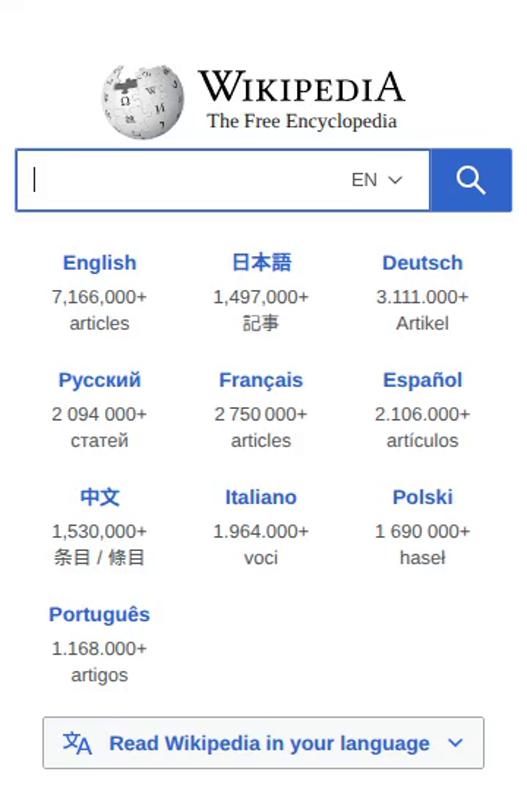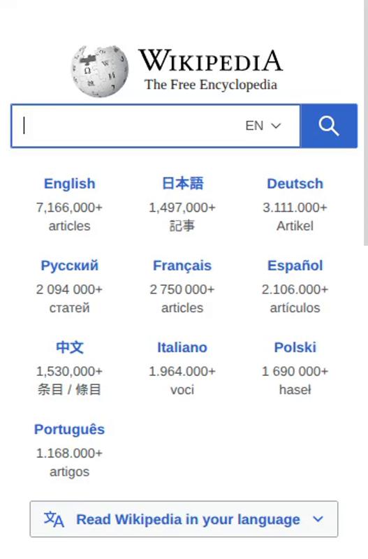 | <img class="central-featured-logo" src="portal/wikipedia.org/assets/img/Wikipedia-logo-v2.png" srcset="portal/wikipedia.org/assets/img/Wikipedia-logo-v2@1.5x.png 1.5x, portal/wikipedia.org/assets/img/Wikipedia-logo-v2@2x.png 2x" width="200" height="183" alt=""> | |||||