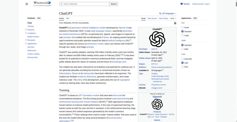 | <img src="//upload.wikimedia.org/wikipedia/commons/thumb/6/66/OpenAI_logo_2025_%28symbol%29.svg/250px-OpenAI_logo_2025_%28symbol%29.svg.png" decoding="async" width="130" height="129" style="--mw-file-upright: 0.5" class="mw-file-element mw-file-upright" srcset="//upload.wikimedia.org/wikipedia/commons/thumb/6/66/OpenAI_logo_2025_%28symbol%29.svg/330px-OpenAI_logo_2025_%28symbol%29.svg.png 2x" data-file-width="512" data-file-height="507"> | |||||