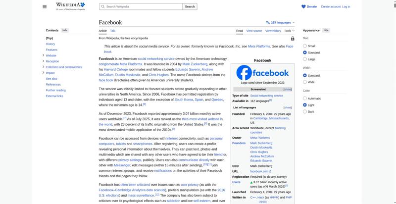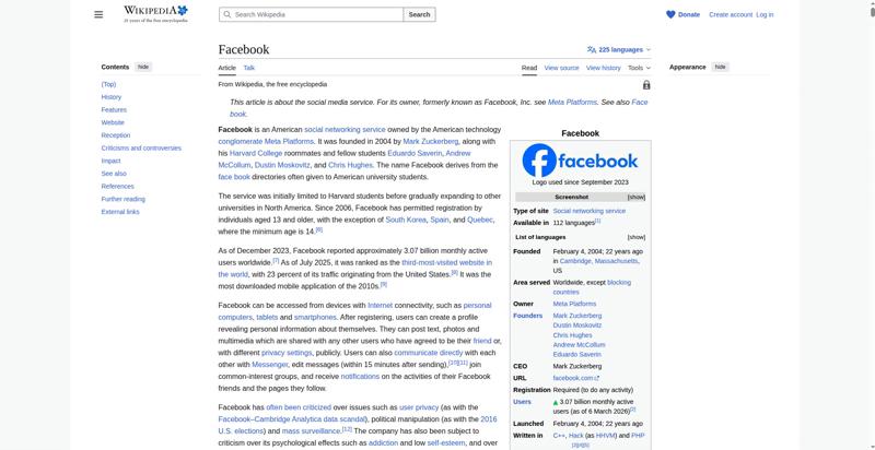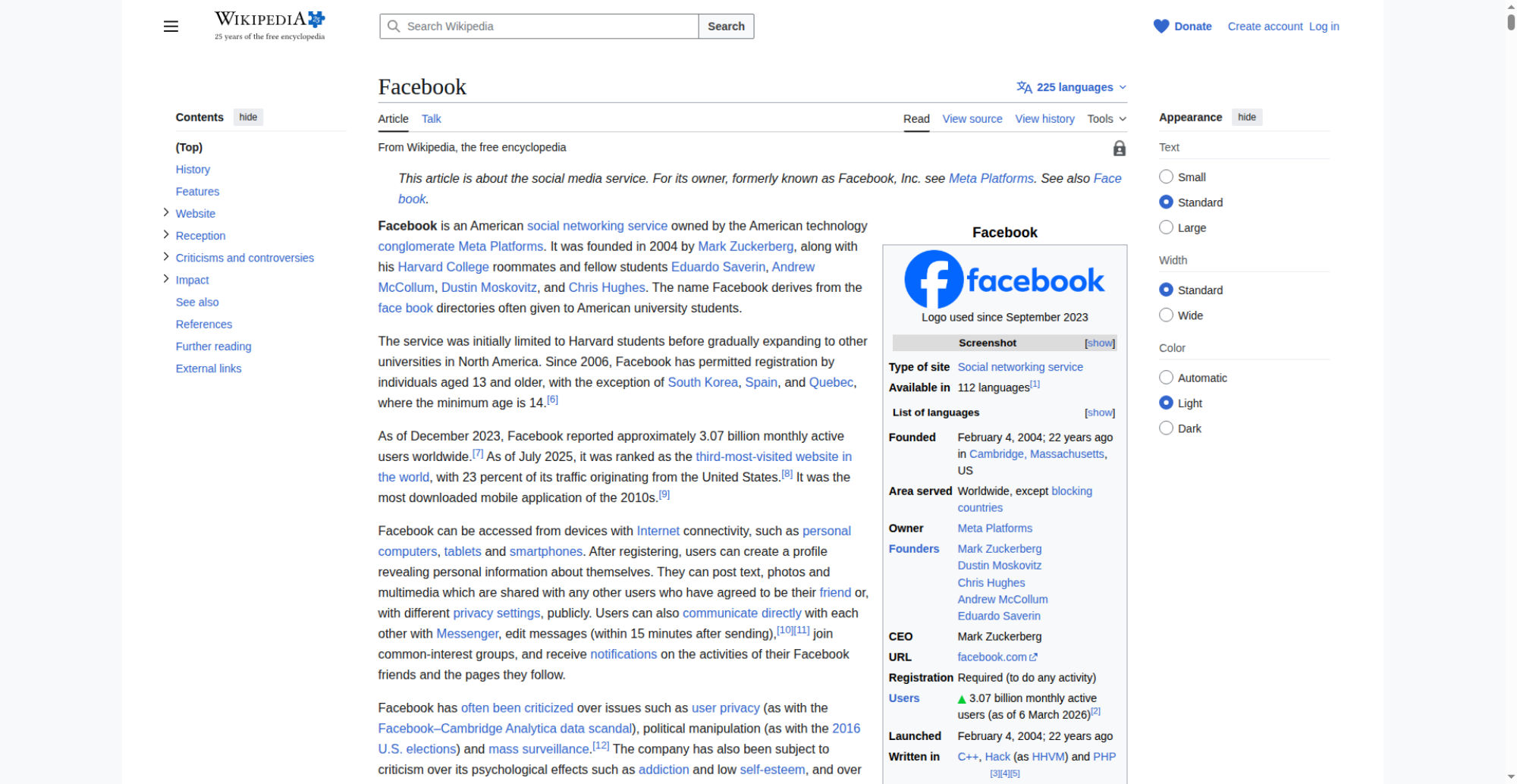 | Offenders: https://upload.wikimedia.org/wikipedia/en/thumb/1/1b/Semi-protection-shackle.svg...n-shackle.svg.png https://upload.wikimedia.org/wikipedia/commons/thumb/b/b9/2023_Facebook_icon.svg...book_icon.svg.png https://upload.wikimedia.org/wikipedia/commons/thumb/9/93/Facebook_logo_%282023%...282023%29.svg.png https://upload.wikimedia.org/wikipedia/en/6/64/Facebook_user_page.png https://upload.wikimedia.org/wikipedia/commons/thumb/b/b0/Increase2.svg/20px-Increase2.svg.png https://upload.wikimedia.org/wikipedia/commons/thumb/0/05/Meta_Platforms_Inc._lo...ropped%29.svg.png https://upload.wikimedia.org/wikipedia/commons/thumb/9/99/Wiktionary-logo-en-v2....ogo-en-v2.svg.png https://upload.wikimedia.org/wikipedia/en/thumb/4/4a/Commons-logo.svg/20px-Commons-logo.svg.png https://upload.wikimedia.org/wikipedia/commons/thumb/f/fa/Wikiquote-logo.svg/40p...uote-logo.svg.png https://upload.wikimedia.org/wikipedia/commons/thumb/3/32/Scholia_logo.svg/40px-Scholia_logo.svg.png https://upload.wikimedia.org/wikipedia/commons/thumb/f/fc/MarkZuckerberg-crop.jp...ckerberg-crop.jpg https://upload.wikimedia.org/wikipedia/en/thumb/1/12/Original-facebook.jpg/250px...inal-facebook.jpg https://upload.wikimedia.org/wikipedia/en/thumb/8/8a/OOjs_UI_icon_edit-ltr-progr...ogressive.svg.png https://upload.wikimedia.org/wikipedia/commons/thumb/0/06/Facebook.svg/250px-Facebook.svg.png https://upload.wikimedia.org/wikipedia/commons/thumb/6/69/Screen_of_Facebook_%28...ebook_%282%29.PNG https://upload.wikimedia.org/wikipedia/commons/3/38/Facebook_Like_React.png https://upload.wikimedia.org/wikipedia/commons/thumb/f/f4/Facebook_t-shirt_with_...d_for_Hackers.jpg https://upload.wikimedia.org/wikipedia/commons/thumb/5/5d/Population_pyramid_of_..._users_by_age.png https://upload.wikimedia.org/wikipedia/commons/thumb/9/9c/Facebook_censorship.sv...ensorship.svg.png https://upload.wikimedia.org/wikipedia/commons/thumb/f/f3/PRISM_Collection_Detai...ction_Details.jpg https://upload.wikimedia.org/wikipedia/commons/thumb/6/62/Onavo_logo.png/250px-Onavo_logo.png https://upload.wikimedia.org/wikipedia/commons/thumb/2/26/Hands_Off%21_protest%2...5%2C_2025-053.jpg https://upload.wikimedia.org/wikipedia/commons/thumb/c/c9/Berlin_%289163009052%2...9163009052%29.jpg https://upload.wikimedia.org/wikipedia/commons/thumb/6/61/Ad-tech_London_2010_%2..._2010_%285%29.JPG https://upload.wikimedia.org/wikipedia/commons/thumb/2/27/2011_Egyptian_protests...26_jan25_card.jpg https://upload.wikimedia.org/wikipedia/commons/thumb/9/99/SF_Pride_2014_-_Stierc...4_-_Stierch_7.jpg https://upload.wikimedia.org/wikipedia/commons/thumb/2/2a/Industry5.svg/40px-Industry5.svg.png https://upload.wikimedia.org/wikipedia/commons/thumb/f/f9/Crystal_Clear_app_linn...ghborhood.svg.png https://upload.wikimedia.org/wikipedia/commons/a/aa/Lock-red-alt-2.svg https://upload.wikimedia.org/wikipedia/commons/4/4d/Icon_pdf_file.png https://upload.wikimedia.org/wikipedia/commons/6/65/Lock-green.svg https://upload.wikimedia.org/wikipedia/commons/d/d6/Lock-gray-alt-2.svg https://en.wikipedia.org/wiki/Special:CentralAutoLogin/start?useformat=desktop&type=script&usesul3=1 https://auth.wikimedia.org/metawiki/wiki/Special:CentralAutoLogin/checkLoggedIn...gin/checkLoggedIn |