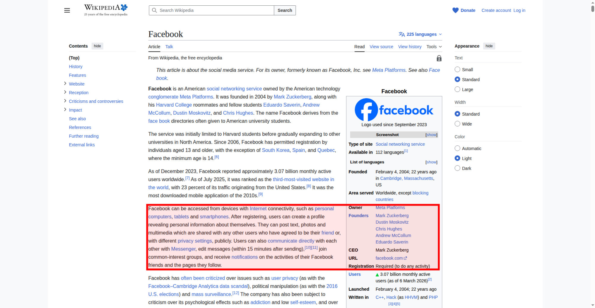| Offenders: https://upload.wikimedia.org/wikipedia/en/thumb/1/1b/Semi-protection-shackle.svg...n-shackle.svg.png https://upload.wikimedia.org/wikipedia/commons/thumb/b/b9/2023_Facebook_icon.svg...book_icon.svg.png https://upload.wikimedia.org/wikipedia/commons/thumb/9/93/Facebook_logo_%282023%...282023%29.svg.png https://upload.wikimedia.org/wikipedia/en/6/64/Facebook_user_page.png https://upload.wikimedia.org/wikipedia/commons/thumb/b/b0/Increase2.svg/20px-Increase2.svg.png https://upload.wikimedia.org/wikipedia/commons/thumb/0/05/Meta_Platforms_Inc._lo...ropped%29.svg.png https://upload.wikimedia.org/wikipedia/commons/thumb/9/99/Wiktionary-logo-en-v2....ogo-en-v2.svg.png https://upload.wikimedia.org/wikipedia/en/thumb/4/4a/Commons-logo.svg/20px-Commons-logo.svg.png https://upload.wikimedia.org/wikipedia/commons/thumb/f/fa/Wikiquote-logo.svg/40p...uote-logo.svg.png https://upload.wikimedia.org/wikipedia/commons/thumb/3/32/Scholia_logo.svg/40px-Scholia_logo.svg.png https://upload.wikimedia.org/wikipedia/commons/thumb/f/fc/MarkZuckerberg-crop.jp...ckerberg-crop.jpg https://upload.wikimedia.org/wikipedia/en/thumb/1/12/Original-facebook.jpg/250px...inal-facebook.jpg https://upload.wikimedia.org/wikipedia/commons/thumb/0/06/Facebook.svg/250px-Facebook.svg.png https://upload.wikimedia.org/wikipedia/commons/thumb/6/69/Screen_of_Facebook_%28...ebook_%282%29.PNG https://upload.wikimedia.org/wikipedia/commons/3/38/Facebook_Like_React.png https://upload.wikimedia.org/wikipedia/commons/thumb/f/f4/Facebook_t-shirt_with_...d_for_Hackers.jpg https://upload.wikimedia.org/wikipedia/commons/thumb/5/5d/Population_pyramid_of_..._users_by_age.png https://upload.wikimedia.org/wikipedia/commons/thumb/9/9c/Facebook_censorship.sv...ensorship.svg.png https://upload.wikimedia.org/wikipedia/commons/thumb/f/f3/PRISM_Collection_Detai...ction_Details.jpg https://upload.wikimedia.org/wikipedia/commons/thumb/6/62/Onavo_logo.png/250px-Onavo_logo.png https://upload.wikimedia.org/wikipedia/commons/thumb/2/26/Hands_Off%21_protest%2...5%2C_2025-053.jpg https://upload.wikimedia.org/wikipedia/commons/thumb/c/c9/Berlin_%289163009052%2...9163009052%29.jpg https://upload.wikimedia.org/wikipedia/commons/thumb/6/61/Ad-tech_London_2010_%2..._2010_%285%29.JPG https://upload.wikimedia.org/wikipedia/commons/thumb/2/27/2011_Egyptian_protests...26_jan25_card.jpg https://upload.wikimedia.org/wikipedia/commons/thumb/9/99/SF_Pride_2014_-_Stierc...4_-_Stierch_7.jpg https://upload.wikimedia.org/wikipedia/commons/thumb/2/2a/Industry5.svg/40px-Industry5.svg.png https://upload.wikimedia.org/wikipedia/commons/thumb/f/f9/Crystal_Clear_app_linn...ghborhood.svg.png https://upload.wikimedia.org/wikipedia/en/thumb/8/8a/OOjs_UI_icon_edit-ltr-progr...ogressive.svg.png https://upload.wikimedia.org/wikipedia/commons/a/aa/Lock-red-alt-2.svg https://upload.wikimedia.org/wikipedia/commons/4/4d/Icon_pdf_file.png https://upload.wikimedia.org/wikipedia/commons/6/65/Lock-green.svg https://upload.wikimedia.org/wikipedia/commons/d/d6/Lock-gray-alt-2.svg https://en.wikipedia.org/wiki/Special:CentralAutoLogin/start?useformat=desktop&type=script&usesul3=1 https://auth.wikimedia.org/metawiki/wiki/Special:CentralAutoLogin/checkLoggedIn...gin/checkLoggedIn |