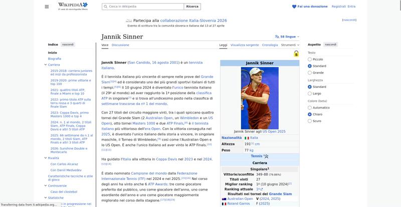 <img resource="//it.wikipedia.org/wiki/File:Jannik_Sinner_US_Open_2025_(cropped).jpg" src="//upload.wikimedia.org/wikipedia/commons/thumb/4/48/Jannik_Sinner_US_Open_2025_%28cropped%29.jpg/250px-Jannik_Sinner_US_Open_2025_%28cropped%29.jpg" decoding="async" data-file-width="1204" data-file-height="2000" data-file-type="bitmap" height="300" width="180" srcset="//upload.wikimedia.org/wikipedia/commons/thumb/4/48/Jannik_Sinner_US_Open_2025_%28cropped%29.jpg/500px-Jannik_Sinner_US_Open_2025_%28cropped%29.jpg 2x" class="mw-file-element">