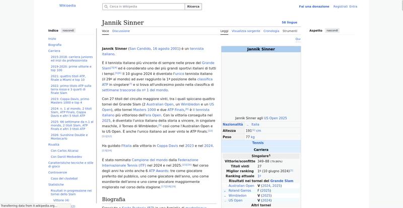 | Offenders: https://upload.wikimedia.org/wikipedia/commons/thumb/a/a5/Semi-protection-shackl...le-itwiki.svg.png https://upload.wikimedia.org/wikipedia/commons/thumb/0/03/Flag_of_Italy.svg/20px..._of_Italy.svg.png https://upload.wikimedia.org/wikipedia/commons/thumb/b/b9/Flag_of_Australia.svg/...Australia.svg.png https://upload.wikimedia.org/wikipedia/commons/thumb/c/c3/Flag_of_France.svg/20p...of_France.svg.png https://upload.wikimedia.org/wikipedia/commons/thumb/8/83/Flag_of_the_United_Kin...%283-5%29.svg.png https://upload.wikimedia.org/wikipedia/commons/thumb/a/a4/Flag_of_the_United_Sta...ed_States.svg.png https://upload.wikimedia.org/wikipedia/commons/8/8c/Transparent.png https://upload.wikimedia.org/wikipedia/commons/6/6a/Jannik_Sinner_logo.png https://upload.wikimedia.org/wikipedia/commons/thumb/8/87/Magnifying_glass_icon_...icon_mgx2.svg.png https://upload.wikimedia.org/wikipedia/commons/thumb/f/f3/Flag_of_Russia.svg/20p...of_Russia.svg.png https://upload.wikimedia.org/wikipedia/commons/thumb/b/ba/Flag_of_Germany.svg/20...f_Germany.svg.png https://upload.wikimedia.org/wikipedia/commons/thumb/9/9a/Flag_of_Spain.svg/20px..._of_Spain.svg.png https://upload.wikimedia.org/wikipedia/commons/thumb/9/9c/Nastrino_Stella_Merito...tivo_2015.svg.png https://upload.wikimedia.org/wikipedia/commons/thumb/4/42/35mm_film_frames.svg/2...lm_frames.svg.png https://upload.wikimedia.org/wikipedia/commons/thumb/2/24/Wikinews-logo.svg/20px...news-logo.svg.png https://upload.wikimedia.org/wikipedia/commons/thumb/7/73/Blue_pencil.svg/20px-Blue_pencil.svg.png https://upload.wikimedia.org/wikipedia/commons/thumb/f/ff/Flag_of_Serbia.svg/20p...of_Serbia.svg.png https://upload.wikimedia.org/wikipedia/commons/thumb/4/4c/Flag_of_Sweden.svg/20p...of_Sweden.svg.png https://upload.wikimedia.org/wikipedia/commons/6/61/Tennis_icon_nobkg.png https://upload.wikimedia.org/wikipedia/commons/thumb/4/4c/Logo_Slovenija-Italia_...alia_2026.svg.png https://upload.wikimedia.org/wikipedia/commons/thumb/4/48/Jannik_Sinner_US_Open_...%28cropped%29.jpg https://upload.wikimedia.org/wikipedia/commons/thumb/8/85/Tennis_pictogram.svg/4...pictogram.svg.png https://upload.wikimedia.org/wikipedia/commons/thumb/3/3e/ATP_World_Tour_Finals_...London%29.svg.png https://upload.wikimedia.org/wikipedia/commons/thumb/b/be/Jannik_Sinner_after_wi...Milan%2C_2019.jpg https://upload.wikimedia.org/wikipedia/commons/thumb/f/f6/Sinner_MCM23_%288%29_%...2883593853%29.jpg https://upload.wikimedia.org/wikipedia/commons/thumb/6/66/Jannik_Sinner_%282024_...US_Open%29_01.jpg https://upload.wikimedia.org/wikipedia/commons/thumb/f/fa/Wikiquote-logo.svg/20p...uote-logo.svg.png https://upload.wikimedia.org/wikipedia/commons/thumb/4/4a/Commons-logo.svg/20px-Commons-logo.svg.png https://upload.wikimedia.org/wikipedia/commons/thumb/c/cf/Flag_of_Canada.svg/20p...of_Canada.svg.png https://upload.wikimedia.org/wikipedia/commons/thumb/0/03/Flag_of_Italy.svg/60px..._of_Italy.svg.png https://upload.wikimedia.org/wikipedia/commons/thumb/c/cb/Flag_of_Romania_%28196...931989%29.svg.png https://upload.wikimedia.org/wikipedia/commons/thumb/c/cb/Flag_of_the_Czech_Repu..._Republic.svg.png https://upload.wikimedia.org/wikipedia/commons/thumb/4/41/Flag_of_Austria.svg/20...f_Austria.svg.png https://upload.wikimedia.org/wikipedia/commons/thumb/7/78/Flag_of_Chile.svg/20px..._of_Chile.svg.png https://upload.wikimedia.org/wikipedia/commons/thumb/0/05/Flag_of_Brazil.svg/20p...of_Brazil.svg.png https://upload.wikimedia.org/wikipedia/commons/thumb/f/f3/Flag_of_Switzerland.sv...itzerland.svg.png https://upload.wikimedia.org/wikipedia/commons/thumb/6/67/Crystal_Clear_app_Logi...n_Manager.svg.png https://en.wikipedia.org/w/index.php...a.org/w/index.php https://en.wikipedia.org/w/index.php...a.org/w/index.php https://it.wikipedia.org/wiki/Special:CentralAutoLogin/start?useformat=desktop&type=script&usesul3=1 https://auth.wikimedia.org/metawiki/wiki/Special:CentralAutoLogin/checkLoggedIn...gin/checkLoggedIn |