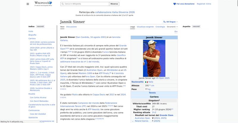 | Offenders: https://upload.wikimedia.org/wikipedia/commons/thumb/a/a5/Semi-protection-shackl...le-itwiki.svg.png https://upload.wikimedia.org/wikipedia/commons/thumb/0/03/Flag_of_Italy.svg/20px..._of_Italy.svg.png https://upload.wikimedia.org/wikipedia/commons/thumb/b/b9/Flag_of_Australia.svg/...Australia.svg.png https://upload.wikimedia.org/wikipedia/commons/thumb/c/c3/Flag_of_France.svg/20p...of_France.svg.png https://upload.wikimedia.org/wikipedia/commons/thumb/8/83/Flag_of_the_United_Kin...%283-5%29.svg.png https://upload.wikimedia.org/wikipedia/commons/thumb/a/a4/Flag_of_the_United_Sta...ed_States.svg.png https://upload.wikimedia.org/wikipedia/commons/8/8c/Transparent.png https://upload.wikimedia.org/wikipedia/commons/6/6a/Jannik_Sinner_logo.png https://upload.wikimedia.org/wikipedia/commons/thumb/8/87/Magnifying_glass_icon_...icon_mgx2.svg.png https://upload.wikimedia.org/wikipedia/commons/thumb/f/f3/Flag_of_Russia.svg/20p...of_Russia.svg.png https://upload.wikimedia.org/wikipedia/commons/thumb/b/ba/Flag_of_Germany.svg/20...f_Germany.svg.png https://upload.wikimedia.org/wikipedia/commons/thumb/9/9a/Flag_of_Spain.svg/20px..._of_Spain.svg.png https://upload.wikimedia.org/wikipedia/commons/thumb/9/9c/Nastrino_Stella_Merito...tivo_2015.svg.png https://upload.wikimedia.org/wikipedia/commons/thumb/4/42/35mm_film_frames.svg/2...lm_frames.svg.png https://upload.wikimedia.org/wikipedia/commons/thumb/2/24/Wikinews-logo.svg/20px...news-logo.svg.png https://upload.wikimedia.org/wikipedia/commons/thumb/7/73/Blue_pencil.svg/20px-Blue_pencil.svg.png https://upload.wikimedia.org/wikipedia/commons/thumb/f/ff/Flag_of_Serbia.svg/20p...of_Serbia.svg.png https://upload.wikimedia.org/wikipedia/commons/thumb/4/4c/Flag_of_Sweden.svg/20p...of_Sweden.svg.png https://upload.wikimedia.org/wikipedia/commons/6/61/Tennis_icon_nobkg.png https://upload.wikimedia.org/wikipedia/commons/thumb/4/4c/Logo_Slovenija-Italia_...alia_2026.svg.png https://upload.wikimedia.org/wikipedia/commons/thumb/4/48/Jannik_Sinner_US_Open_...%28cropped%29.jpg https://upload.wikimedia.org/wikipedia/commons/thumb/8/85/Tennis_pictogram.svg/4...pictogram.svg.png https://upload.wikimedia.org/wikipedia/commons/thumb/3/3e/ATP_World_Tour_Finals_...London%29.svg.png https://upload.wikimedia.org/wikipedia/commons/thumb/b/be/Jannik_Sinner_after_wi...Milan%2C_2019.jpg https://upload.wikimedia.org/wikipedia/commons/thumb/f/f6/Sinner_MCM23_%288%29_%...2883593853%29.jpg https://upload.wikimedia.org/wikipedia/commons/thumb/6/66/Jannik_Sinner_%282024_...US_Open%29_01.jpg https://upload.wikimedia.org/wikipedia/commons/thumb/f/fa/Wikiquote-logo.svg/20p...uote-logo.svg.png https://upload.wikimedia.org/wikipedia/commons/thumb/4/4a/Commons-logo.svg/20px-Commons-logo.svg.png https://upload.wikimedia.org/wikipedia/commons/thumb/c/cf/Flag_of_Canada.svg/20p...of_Canada.svg.png https://upload.wikimedia.org/wikipedia/commons/thumb/0/03/Flag_of_Italy.svg/60px..._of_Italy.svg.png https://upload.wikimedia.org/wikipedia/commons/thumb/c/cb/Flag_of_Romania_%28196...931989%29.svg.png https://upload.wikimedia.org/wikipedia/commons/thumb/c/cb/Flag_of_the_Czech_Repu..._Republic.svg.png https://upload.wikimedia.org/wikipedia/commons/thumb/4/41/Flag_of_Austria.svg/20...f_Austria.svg.png https://upload.wikimedia.org/wikipedia/commons/thumb/7/78/Flag_of_Chile.svg/20px..._of_Chile.svg.png https://upload.wikimedia.org/wikipedia/commons/thumb/0/05/Flag_of_Brazil.svg/20p...of_Brazil.svg.png https://upload.wikimedia.org/wikipedia/commons/thumb/f/f3/Flag_of_Switzerland.sv...itzerland.svg.png https://upload.wikimedia.org/wikipedia/commons/thumb/6/67/Crystal_Clear_app_Logi...n_Manager.svg.png https://en.wikipedia.org/w/index.php...a.org/w/index.php https://en.wikipedia.org/w/index.php...a.org/w/index.php https://it.wikipedia.org/wiki/Special:CentralAutoLogin/start?useformat=desktop&type=script&usesul3=1 https://auth.wikimedia.org/metawiki/wiki/Special:CentralAutoLogin/checkLoggedIn...gin/checkLoggedIn |