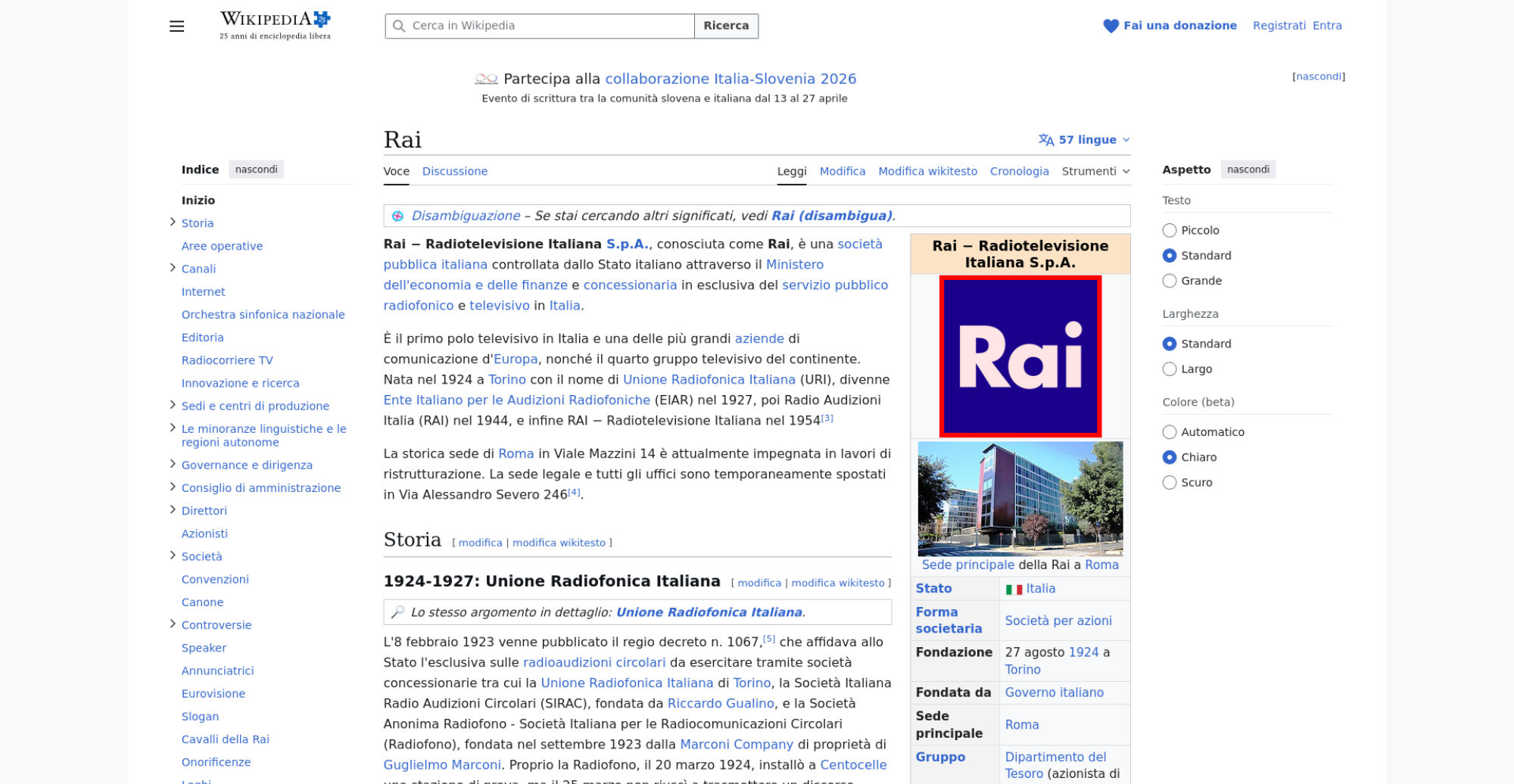<img alt="Logo" resource="//it.wikipedia.org/wiki/File:Logo_of_RAI_(2016).svg" src="//upload.wikimedia.org/wikipedia/commons/thumb/8/88/Logo_of_RAI_%282016%29.svg/250px-Logo_of_RAI_%282016%29.svg.png" decoding="async" data-file-width="512" data-file-height="512" data-file-type="drawing" height="200" width="200" srcset="//upload.wikimedia.org/wikipedia/commons/thumb/8/88/Logo_of_RAI_%282016%29.svg/500px-Logo_of_RAI_%282016%29.svg.png 2x" class="mw-file-element">