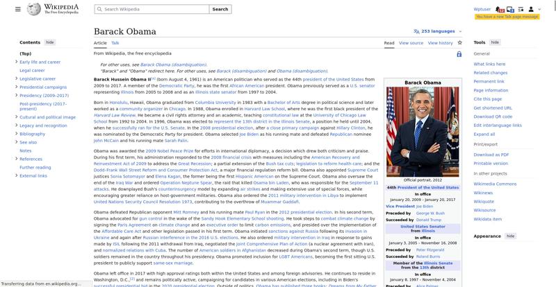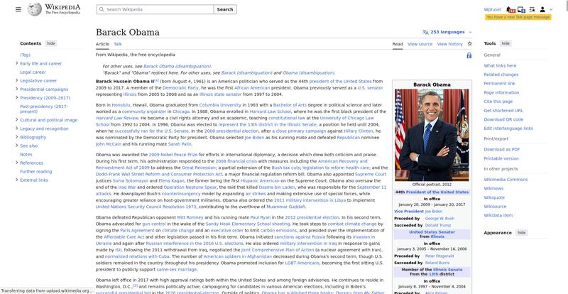 | Offenders: https://en.wikipedia.org/static/images/mobile/copyright/wikipedia-wordmark-en.svg https://en.wikipedia.org/static/images/mobile/copyright/wikipedia-tagline-en.svg https://upload.wikimedia.org/wikipedia/en/thumb/8/8c/Extended-protection-shackle...n-shackle.svg.png https://upload.wikimedia.org/wikipedia/commons/thumb/8/8d/President_Barack_Obama..._Barack_Obama.jpg https://upload.wikimedia.org/wikipedia/commons/thumb/1/11/Barack_Obama_signature...signature.svg.png https://upload.wikimedia.org/wikipedia/commons/thumb/3/36/Seal_of_the_President_...ed_States.svg.png https://upload.wikimedia.org/wikipedia/commons/thumb/e/e7/Obama_2008_portrait_cr...se_cropped%29.jpg https://upload.wikimedia.org/wikipedia/en/thumb/3/33/Ann_Dunham_with_father_and_..._and_children.jpg https://upload.wikimedia.org/wikipedia/commons/thumb/9/99/Barry_Soetoro_school_r...school_record.jpg https://upload.wikimedia.org/wikipedia/commons/thumb/1/1b/Nuvola_apps_kaboodle.s..._kaboodle.svg.png https://upload.wikimedia.org/wikipedia/commons/thumb/2/26/Obama_family_portrait_...he_Green_Room.jpg https://upload.wikimedia.org/wikipedia/commons/thumb/3/3d/Obamas_at_church_on_In...tion_Day_2013.jpg https://upload.wikimedia.org/wikipedia/commons/thumb/b/b6/Obamamiltondavis1.jpg/...amiltondavis1.jpg https://upload.wikimedia.org/wikipedia/commons/thumb/a/a4/Chicago%2C_November_2%...5471954323%29.jpg https://upload.wikimedia.org/wikipedia/commons/thumb/f/f1/BarackObamaportrait.jp...Obamaportrait.jpg https://upload.wikimedia.org/wikipedia/commons/thumb/2/24/ElectoralCollege2008.s...llege2008.svg.png https://upload.wikimedia.org/wikipedia/commons/thumb/3/33/Barack_obama_by_bill_c...y_bill_cramer.jpg https://upload.wikimedia.org/wikipedia/commons/thumb/4/44/ElectoralCollege2012.s...llege2012.svg.png https://upload.wikimedia.org/wikipedia/commons/thumb/a/a4/Modern_Liberalism_Flag...American_Flag.png https://upload.wikimedia.org/wikipedia/commons/thumb/1/1b/Yellow_flag_waving.svg...ag_waving.svg.png https://upload.wikimedia.org/wikipedia/en/thumb/a/a4/Flag_of_the_United_States.s...ed_States.svg.png https://upload.wikimedia.org/wikipedia/commons/thumb/d/d7/US_President_Barack_Ob...e_-_2009Jan20.jpg https://upload.wikimedia.org/wikipedia/commons/thumb/e/e9/Official_portrait_of_B..._Barack_Obama.jpg https://upload.wikimedia.org/wikipedia/commons/thumb/3/32/Barack_Obama_addresses...ss_2009-02-24.jpg https://upload.wikimedia.org/wikipedia/commons/thumb/4/4b/Barack_Obama_visiting_...rora_shooting.jpg https://upload.wikimedia.org/wikipedia/commons/thumb/f/fc/U.S._Total_Deficits_vs...ses_2001-2010.png https://upload.wikimedia.org/wikipedia/commons/thumb/2/25/US_Employment_Statisti...tatistics.svg.png https://upload.wikimedia.org/wikipedia/commons/thumb/9/9f/Job_Growth_by_U.S._Pre...resident_-_v1.png https://upload.wikimedia.org/wikipedia/commons/thumb/6/63/Obama-venice-la.jpg/25...ama-venice-la.jpg https://upload.wikimedia.org/wikipedia/commons/thumb/7/79/PPACA_Premium_Chart.jp...Premium_Chart.jpg https://upload.wikimedia.org/wikipedia/commons/thumb/8/84/Percentage_of_Individu...%2C_1963-2015.png https://upload.wikimedia.org/wikipedia/commons/thumb/9/99/P06409PS-0571_%2835946...3594694537%29.jpg https://upload.wikimedia.org/wikipedia/commons/thumb/6/6f/Barack_Obama%27s_trip_..._2016_%289%29.jpg https://upload.wikimedia.org/wikipedia/commons/thumb/7/70/Barack_Obama_with_Afgh...and_Joe_Biden.jpg https://upload.wikimedia.org/wikipedia/commons/thumb/a/ac/Obama_and_Biden_await_..._on_bin_Laden.jpg https://upload.wikimedia.org/wikipedia/commons/thumb/f/f6/Handshake_between_the_...C3%BAl_Castro.jpg https://upload.wikimedia.org/wikipedia/commons/thumb/1/1b/Barack_Obama_welcomes_...e_Oval_Office.jpg https://upload.wikimedia.org/wikipedia/commons/thumb/1/17/Barack_Obama_talks_wit...8637772147%29.jpg https://upload.wikimedia.org/wikipedia/commons/thumb/e/eb/Vladimir_Putin_and_Bar...5-09-29%29_01.jpg https://upload.wikimedia.org/wikipedia/commons/thumb/9/96/Obama_Macri_October_20..._October_2017.jpg https://upload.wikimedia.org/wikipedia/commons/thumb/1/15/P20220405AS-1082_%2852...2067439422%29.jpg https://upload.wikimedia.org/wikipedia/commons/thumb/2/28/Former_President_Barac...%28cropped%29.jpg https://upload.wikimedia.org/wikipedia/commons/thumb/b/b3/NewDemCoalition-logo.j...oalition-logo.jpg https://upload.wikimedia.org/wikipedia/en/thumb/0/01/A_coloured_voting_box.svg/2...oting_box.svg.png https://upload.wikimedia.org/wikipedia/commons/thumb/c/c0/Gallup_Poll-Approval_R...ack_Obama.svg.png https://upload.wikimedia.org/wikipedia/en/thumb/6/69/P_vip.svg/40px-P_vip.svg.png https://upload.wikimedia.org/wikipedia/en/thumb/a/a4/Flag_of_the_United_States.s...ed_States.svg.png https://upload.wikimedia.org/wikipedia/commons/thumb/e/ef/Flag_of_Hawaii.svg/40p...of_Hawaii.svg.png https://upload.wikimedia.org/wikipedia/commons/thumb/9/9b/Flag_of_Chicago%2C_Ill..._Illinois.svg.png https://upload.wikimedia.org/wikipedia/commons/thumb/0/01/Flag_of_Illinois.svg/4..._Illinois.svg.png https://upload.wikimedia.org/wikipedia/commons/thumb/1/17/Balance%2C_by_David.sv..._by_David.svg.png https://upload.wikimedia.org/wikipedia/en/thumb/0/01/A_coloured_voting_box.svg/4...oting_box.svg.png https://upload.wikimedia.org/wikipedia/commons/thumb/c/c1/Blue_iPod_Nano.jpg/20px-Blue_iPod_Nano.jpg https://en.wikipedia.org/w/load.php...ia.org/w/load.php https://en.wikipedia.org/w/load.php...ia.org/w/load.php https://en.wikipedia.org/w/load.php...ia.org/w/load.php https://en.wikipedia.org/w/load.php...ia.org/w/load.php https://en.wikipedia.org/w/load.php...ia.org/w/load.php https://en.wikipedia.org/w/load.php...ia.org/w/load.php https://en.wikipedia.org/w/load.php...ia.org/w/load.php https://en.wikipedia.org/w/load.php...ia.org/w/load.php https://en.wikipedia.org/w/load.php...ia.org/w/load.php https://en.wikipedia.org/w/load.php...ia.org/w/load.php https://en.wikipedia.org/w/load.php...ia.org/w/load.php https://en.wikipedia.org/w/load.php...ia.org/w/load.php https://en.wikipedia