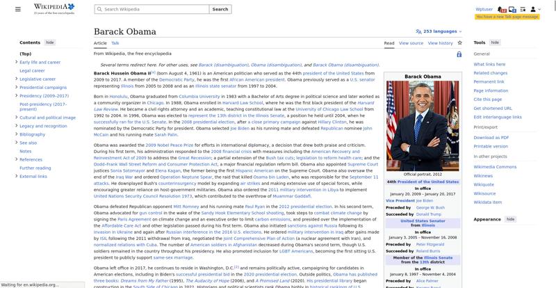 | Offenders: https://en.wikipedia.org/static/images/icons/enwiki-25.svg https://en.wikipedia.org/static/images/mobile/copyright/wikipedia-tagline-en-25.svg https://upload.wikimedia.org/wikipedia/en/thumb/8/8c/Extended-protection-shackle...n-shackle.svg.png https://upload.wikimedia.org/wikipedia/commons/thumb/8/8d/President_Barack_Obama..._Barack_Obama.jpg https://upload.wikimedia.org/wikipedia/commons/thumb/1/11/Barack_Obama_signature...signature.svg.png https://upload.wikimedia.org/wikipedia/commons/thumb/f/f9/Obama_portrait_crop.jp...portrait_crop.jpg https://upload.wikimedia.org/wikipedia/commons/thumb/3/36/Seal_of_the_President_...ed_States.svg.png https://upload.wikimedia.org/wikipedia/en/thumb/3/33/Ann_Dunham_with_father_and_..._and_children.jpg https://upload.wikimedia.org/wikipedia/commons/thumb/9/99/Barry_Soetoro_school_r...school_record.jpg https://upload.wikimedia.org/wikipedia/commons/thumb/1/1b/Nuvola_apps_kaboodle.s..._kaboodle.svg.png https://upload.wikimedia.org/wikipedia/commons/thumb/2/26/Obama_family_portrait_...he_Green_Room.jpg https://upload.wikimedia.org/wikipedia/commons/thumb/3/3d/Obamas_at_church_on_In...tion_Day_2013.jpg https://upload.wikimedia.org/wikipedia/commons/thumb/b/b6/Obamamiltondavis1.jpg/...amiltondavis1.jpg https://upload.wikimedia.org/wikipedia/commons/thumb/a/a4/Chicago%2C_November_2%...5471954323%29.jpg https://upload.wikimedia.org/wikipedia/commons/thumb/f/f1/BarackObamaportrait.jp...Obamaportrait.jpg https://upload.wikimedia.org/wikipedia/commons/thumb/2/24/ElectoralCollege2008.s...llege2008.svg.png https://upload.wikimedia.org/wikipedia/commons/thumb/4/44/ElectoralCollege2012.s...llege2012.svg.png https://upload.wikimedia.org/wikipedia/commons/thumb/a/a4/Modern_Liberalism_Flag...American_Flag.png https://upload.wikimedia.org/wikipedia/commons/thumb/1/1b/Yellow_flag_waving.svg...ag_waving.svg.png https://upload.wikimedia.org/wikipedia/en/thumb/a/a4/Flag_of_the_United_States.s...ed_States.svg.png https://upload.wikimedia.org/wikipedia/commons/thumb/d/d7/US_President_Barack_Ob...e_-_2009Jan20.jpg https://upload.wikimedia.org/wikipedia/commons/thumb/e/e9/Official_portrait_of_B..._Barack_Obama.jpg https://upload.wikimedia.org/wikipedia/commons/thumb/3/32/Barack_Obama_addresses...ss_2009-02-24.jpg https://upload.wikimedia.org/wikipedia/commons/thumb/4/4b/Barack_Obama_visiting_...rora_shooting.jpg https://upload.wikimedia.org/wikipedia/commons/thumb/f/fc/U.S._Total_Deficits_vs...ses_2001-2010.png https://upload.wikimedia.org/wikipedia/commons/thumb/2/25/US_Employment_Statisti...tatistics.svg.png https://upload.wikimedia.org/wikipedia/commons/thumb/9/9f/Job_Growth_by_U.S._Pre...resident_-_v1.png https://upload.wikimedia.org/wikipedia/commons/thumb/6/63/Obama-venice-la.jpg/25...ama-venice-la.jpg https://upload.wikimedia.org/wikipedia/commons/thumb/7/79/PPACA_Premium_Chart.jp...Premium_Chart.jpg https://upload.wikimedia.org/wikipedia/commons/thumb/8/84/Percentage_of_Individu...%2C_1963-2015.png https://upload.wikimedia.org/wikipedia/commons/thumb/9/99/P06409PS-0571_%2835946...3594694537%29.jpg https://upload.wikimedia.org/wikipedia/commons/thumb/6/6f/Barack_Obama%27s_trip_..._2016_%289%29.jpg https://upload.wikimedia.org/wikipedia/commons/thumb/7/70/Barack_Obama_with_Afgh...and_Joe_Biden.jpg https://upload.wikimedia.org/wikipedia/commons/thumb/a/ac/Obama_and_Biden_await_..._on_bin_Laden.jpg https://upload.wikimedia.org/wikipedia/commons/thumb/f/f6/Handshake_between_the_...C3%BAl_Castro.jpg https://upload.wikimedia.org/wikipedia/commons/thumb/1/1b/Barack_Obama_welcomes_...e_Oval_Office.jpg https://upload.wikimedia.org/wikipedia/commons/thumb/1/17/Barack_Obama_talks_wit...8637772147%29.jpg https://upload.wikimedia.org/wikipedia/commons/thumb/e/eb/Vladimir_Putin_and_Bar...5-09-29%29_01.jpg https://upload.wikimedia.org/wikipedia/commons/thumb/9/96/Obama_Macri_October_20..._October_2017.jpg https://upload.wikimedia.org/wikipedia/commons/thumb/1/15/P20220405AS-1082_%2852...2067439422%29.jpg https://upload.wikimedia.org/wikipedia/commons/thumb/f/f6/20260306_Chicago%2C_Es...-_Juan_Cano17.jpg https://upload.wikimedia.org/wikipedia/commons/thumb/b/b3/NewDemCoalition-logo.j...oalition-logo.jpg https://upload.wikimedia.org/wikipedia/en/thumb/0/01/A_coloured_voting_box.svg/2...oting_box.svg.png https://upload.wikimedia.org/wikipedia/commons/thumb/c/c0/Gallup_Poll-Approval_R...ack_Obama.svg.png https://upload.wikimedia.org/wikipedia/en/thumb/6/69/P_vip.svg/40px-P_vip.svg.png https://upload.wikimedia.org/wikipedia/en/thumb/a/a4/Flag_of_the_United_States.s...ed_States.svg.png https://upload.wikimedia.org/wikipedia/commons/thumb/e/ef/Flag_of_Hawaii.svg/40p...of_Hawaii.svg.png https://upload.wikimedia.org/wikipedia/commons/thumb/9/9b/Flag_of_Chicago%2C_Ill..._Illinois.svg.png https://upload.wikimedia.org/wikipedia/commons/thumb/0/01/Flag_of_Illinois.svg/4..._Illinois.svg.png https://upload.wikimedia.org/wikipedia/commons/thumb/1/17/Balance%2C_by_David.sv..._by_David.svg.png https://upload.wikimedia.org/wikipedia/en/thumb/0/01/A_coloured_voting_box.svg/4...oting_box.svg.png https://upload.wikimedia.org/wikipedia/commons/thumb/c/c1/Blue_iPod_Nano.jpg/20px-Blue_iPod_Nano.jpg https://upload.wikimedia.org/wikipedia/commons/thumb/9/9d/IPhone5white.png/20px-IPhone5white.png https://en.wikipedia.org/w/load.php...ia.org/w/load.php https://en.wikipedia.org/w/load.php...ia.org/w/load.php https://en.wikipedia.org/w/load.php...ia.org/w/load.php https://en.wikipedia.org/w/load.php...ia.org/w/load.php https://en.wikipedia.org/w/load.php...ia.org/w/load.php https://en.wikipedia.org/w/load.php...ia.org/w/load.php https://en.wikipedia.org/w/load.php...ia.org/w/load.php https://en.wikipedia.org/w/load.php...ia.org/w/load.php https://en.wikipedia.org/w/load.php...ia.org/w/load.php https://en.wikipedia.org/w/load.php...ia.org/w/load.php https://en.wikipedia.org/w/load.php...ia.org/w/load.php https://en.wikipedia.org/w/load.php...ia.org/w/load.php https://en.wikipedia.org/w/load.php...ia.org