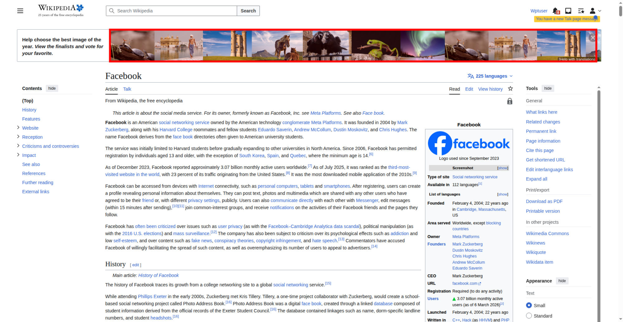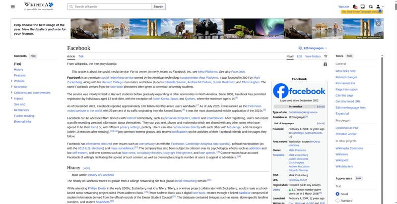 | <img alt="This is a screenshot of Mark Zuckerburg's Facebook profile. It includes his profile photo and a header photo of llamas." src="//upload.wikimedia.org/wikipedia/en/6/64/Facebook_user_page.png" decoding="async" width="300" height="439" class="mw-file-element" data-file-width="261" data-file-height="382"> | |||||