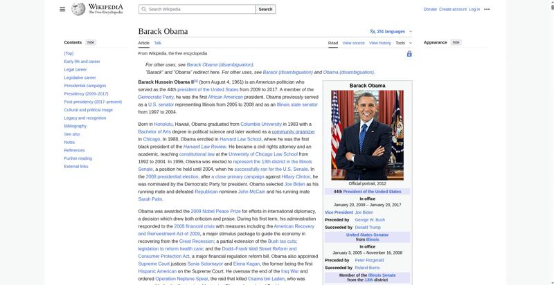 | Offenders: https://upload.wikimedia.org/wikipedia/en/thumb/8/8c/Extended-protection-shackle...n-shackle.svg.png https://upload.wikimedia.org/wikipedia/commons/thumb/8/8d/President_Barack_Obama..._Barack_Obama.jpg https://upload.wikimedia.org/wikipedia/commons/thumb/1/11/Barack_Obama_signature...signature.svg.png https://upload.wikimedia.org/wikipedia/commons/thumb/e/e7/Obama_2008_portrait_cr...se_cropped%29.jpg https://upload.wikimedia.org/wikipedia/commons/thumb/3/36/Seal_of_the_President_...ed_States.svg.png https://upload.wikimedia.org/wikipedia/en/thumb/3/33/Ann_Dunham_with_father_and_..._and_children.jpg https://upload.wikimedia.org/wikipedia/commons/thumb/9/99/Barry_Soetoro_school_r...school_record.jpg https://upload.wikimedia.org/wikipedia/commons/thumb/1/1b/Nuvola_apps_kaboodle.s..._kaboodle.svg.png https://upload.wikimedia.org/wikipedia/commons/thumb/2/26/Obama_family_portrait_...he_Green_Room.jpg https://upload.wikimedia.org/wikipedia/commons/thumb/3/3d/Obamas_at_church_on_In...tion_Day_2013.jpg https://upload.wikimedia.org/wikipedia/commons/thumb/b/b6/Obamamiltondavis1.jpg/...amiltondavis1.jpg https://upload.wikimedia.org/wikipedia/commons/thumb/a/a4/Chicago%2C_November_2%...5471954323%29.jpg https://upload.wikimedia.org/wikipedia/commons/thumb/f/f1/BarackObamaportrait.jp...Obamaportrait.jpg https://upload.wikimedia.org/wikipedia/commons/thumb/2/24/ElectoralCollege2008.s...llege2008.svg.png https://upload.wikimedia.org/wikipedia/commons/thumb/3/33/Barack_obama_by_bill_c...y_bill_cramer.jpg https://upload.wikimedia.org/wikipedia/commons/thumb/4/44/ElectoralCollege2012.s...llege2012.svg.png https://upload.wikimedia.org/wikipedia/commons/thumb/d/d7/US_President_Barack_Ob...e_-_2009Jan20.jpg https://upload.wikimedia.org/wikipedia/commons/thumb/e/e9/Official_portrait_of_B..._Barack_Obama.jpg https://upload.wikimedia.org/wikipedia/commons/thumb/3/32/Barack_Obama_addresses...ss_2009-02-24.jpg https://upload.wikimedia.org/wikipedia/commons/thumb/4/4b/Barack_Obama_visiting_...rora_shooting.jpg https://upload.wikimedia.org/wikipedia/commons/thumb/f/fc/U.S._Total_Deficits_vs...ses_2001-2010.png https://upload.wikimedia.org/wikipedia/commons/thumb/2/25/US_Employment_Statisti...tatistics.svg.png https://upload.wikimedia.org/wikipedia/commons/thumb/9/9f/Job_Growth_by_U.S._Pre...resident_-_v1.png https://upload.wikimedia.org/wikipedia/commons/thumb/6/63/Obama-venice-la.jpg/25...ama-venice-la.jpg https://upload.wikimedia.org/wikipedia/commons/thumb/7/79/PPACA_Premium_Chart.jp...Premium_Chart.jpg https://upload.wikimedia.org/wikipedia/commons/thumb/8/84/Percentage_of_Individu...%2C_1963-2015.png https://upload.wikimedia.org/wikipedia/commons/thumb/9/99/P06409PS-0571_%2835946...3594694537%29.jpg https://upload.wikimedia.org/wikipedia/commons/thumb/6/6f/Barack_Obama%27s_trip_..._2016_%289%29.jpg https://upload.wikimedia.org/wikipedia/commons/thumb/7/70/Barack_Obama_with_Afgh...and_Joe_Biden.jpg https://upload.wikimedia.org/wikipedia/commons/thumb/a/ac/Obama_and_Biden_await_..._on_bin_Laden.jpg https://upload.wikimedia.org/wikipedia/commons/thumb/f/f6/Handshake_between_the_...C3%BAl_Castro.jpg https://upload.wikimedia.org/wikipedia/commons/thumb/1/1b/Barack_Obama_welcomes_...e_Oval_Office.jpg https://upload.wikimedia.org/wikipedia/commons/thumb/1/17/Barack_Obama_talks_wit...8637772147%29.jpg https://upload.wikimedia.org/wikipedia/commons/thumb/e/eb/Vladimir_Putin_and_Bar...5-09-29%29_01.jpg https://upload.wikimedia.org/wikipedia/commons/thumb/9/96/Obama_Macri_October_20..._October_2017.jpg https://upload.wikimedia.org/wikipedia/commons/thumb/1/15/P20220405AS-1082_%2852...2067439422%29.jpg https://upload.wikimedia.org/wikipedia/commons/thumb/2/28/Former_President_Barac...%28cropped%29.jpg https://upload.wikimedia.org/wikipedia/commons/thumb/c/c0/Gallup_Poll-Approval_R...ack_Obama.svg.png https://upload.wikimedia.org/wikipedia/en/thumb/6/69/P_vip.svg/40px-P_vip.svg.png https://upload.wikimedia.org/wikipedia/en/thumb/a/a4/Flag_of_the_United_States.s...ed_States.svg.png https://upload.wikimedia.org/wikipedia/commons/thumb/e/ef/Flag_of_Hawaii.svg/40p...of_Hawaii.svg.png https://upload.wikimedia.org/wikipedia/commons/thumb/9/9b/Flag_of_Chicago%2C_Ill..._Illinois.svg.png https://upload.wikimedia.org/wikipedia/commons/thumb/0/01/Flag_of_Illinois.svg/4..._Illinois.svg.png https://upload.wikimedia.org/wikipedia/commons/thumb/1/17/Balance%2C_by_David.sv..._by_David.svg.png https://upload.wikimedia.org/wikipedia/en/thumb/0/01/A_coloured_voting_box.svg/4...oting_box.svg.png https://upload.wikimedia.org/wikipedia/commons/thumb/c/c1/Blue_iPod_Nano.jpg/20px-Blue_iPod_Nano.jpg https://upload.wikimedia.org/wikipedia/commons/thumb/9/9d/IPhone5white.png/20px-IPhone5white.png https://upload.wikimedia.org/wikipedia/en/thumb/8/8a/OOjs_UI_icon_edit-ltr-progr...ogressive.svg.png https://upload.wikimedia.org/wikipedia/commons/thumb/2/21/Speaker_Icon.svg/20px-Speaker_Icon.svg.png https://upload.wikimedia.org/wikipedia/en/thumb/9/96/Symbol_category_class.svg/2...ory_class.svg.png https://upload.wikimedia.org/wikipedia/en/thumb/d/db/Symbol_list_class.svg/20px-...ist_class.svg.png https://upload.wikimedia.org/wikipedia/commons/thumb/f/f0/Seal_of_the_United_Sta...es_Senate.svg.png https://upload.wikimedia.org/wikipedia/commons/thumb/4/4b/Michelle_Obama_2013_of...cial_portrait.jpg https://upload.wikimedia.org/wikipedia/en/thumb/e/ed/Nobel_Prize.png/120px-Nobel_Prize.png https://upload.wikimedia.org/wikipedia/en/thumb/4/4a/Commons-logo.svg/20px-Commons-logo.svg.png https://upload.wikimedia.org/wikipedia/commons/thumb/2/24/Wikinews-logo.svg/40px...news-logo.svg.png https://upload.wikimedia.org/wikipedia/commons/thumb/f/ff/Wikidata-logo.svg/40px...data-logo.svg.png https://upload.wikimedia.org/wikipedia/commons/a/aa/Lock-red-alt-2.svg https://upload.wikimedia.org/wikipedia/commons/6/65/Lock-green.svg https://upload.wikimedia.org/wikipedia/commons/4/4d/Icon_pdf_file.png https://upload.wikimedia.org/wikipedia/commons/d/d6/Lock-gra