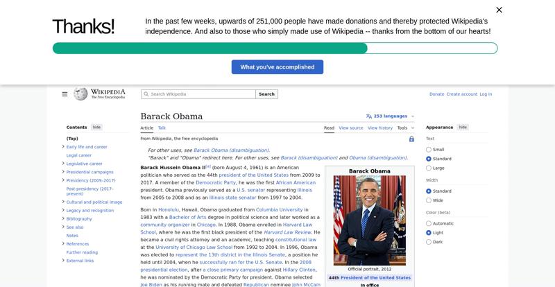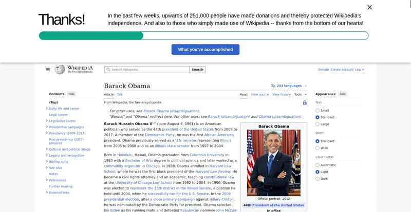 | Offenders: https://en.wikipedia.org/static/images/icons/wikipedia.png https://en.wikipedia.org/static/images/mobile/copyright/wikipedia-wordmark-en.svg https://en.wikipedia.org/static/images/mobile/copyright/wikipedia-tagline-en.svg https://upload.wikimedia.org/wikipedia/en/thumb/8/8c/Extended-protection-shackle...n-shackle.svg.png https://upload.wikimedia.org/wikipedia/commons/thumb/8/8d/President_Barack_Obama..._Barack_Obama.jpg https://upload.wikimedia.org/wikipedia/commons/thumb/1/11/Barack_Obama_signature...signature.svg.png https://upload.wikimedia.org/wikipedia/commons/thumb/e/e7/Obama_2008_portrait_cr...se_cropped%29.jpg https://upload.wikimedia.org/wikipedia/commons/thumb/3/36/Seal_of_the_President_...ed_States.svg.png https://upload.wikimedia.org/wikipedia/en/thumb/3/33/Ann_Dunham_with_father_and_..._and_children.jpg https://upload.wikimedia.org/wikipedia/commons/thumb/9/99/Barry_Soetoro_school_r...school_record.jpg https://upload.wikimedia.org/wikipedia/commons/thumb/1/1b/Nuvola_apps_kaboodle.s..._kaboodle.svg.png https://upload.wikimedia.org/wikipedia/commons/thumb/2/26/Obama_family_portrait_...he_Green_Room.jpg https://upload.wikimedia.org/wikipedia/commons/thumb/3/3d/Obamas_at_church_on_In...tion_Day_2013.jpg https://upload.wikimedia.org/wikipedia/commons/thumb/b/b6/Obamamiltondavis1.jpg/...amiltondavis1.jpg https://upload.wikimedia.org/wikipedia/commons/thumb/a/a4/Chicago%2C_November_2%...5471954323%29.jpg https://upload.wikimedia.org/wikipedia/commons/thumb/f/f1/BarackObamaportrait.jp...Obamaportrait.jpg https://upload.wikimedia.org/wikipedia/commons/thumb/2/24/ElectoralCollege2008.s...llege2008.svg.png https://upload.wikimedia.org/wikipedia/commons/thumb/3/33/Barack_obama_by_bill_c...y_bill_cramer.jpg https://upload.wikimedia.org/wikipedia/commons/thumb/4/44/ElectoralCollege2012.s...llege2012.svg.png https://upload.wikimedia.org/wikipedia/commons/thumb/a/a4/Modern_Liberalism_Flag...American_Flag.png https://upload.wikimedia.org/wikipedia/commons/thumb/1/1b/Yellow_flag_waving.svg...ag_waving.svg.png https://upload.wikimedia.org/wikipedia/en/thumb/a/a4/Flag_of_the_United_States.s...ed_States.svg.png https://upload.wikimedia.org/wikipedia/commons/thumb/d/d7/US_President_Barack_Ob...e_-_2009Jan20.jpg https://upload.wikimedia.org/wikipedia/commons/thumb/e/e9/Official_portrait_of_B..._Barack_Obama.jpg https://upload.wikimedia.org/wikipedia/commons/thumb/3/32/Barack_Obama_addresses...ss_2009-02-24.jpg https://upload.wikimedia.org/wikipedia/commons/thumb/4/4b/Barack_Obama_visiting_...rora_shooting.jpg https://upload.wikimedia.org/wikipedia/commons/thumb/f/fc/U.S._Total_Deficits_vs...ses_2001-2010.png https://upload.wikimedia.org/wikipedia/commons/thumb/2/25/US_Employment_Statisti...tatistics.svg.png https://upload.wikimedia.org/wikipedia/commons/thumb/9/9f/Job_Growth_by_U.S._Pre...resident_-_v1.png https://upload.wikimedia.org/wikipedia/commons/thumb/6/63/Obama-venice-la.jpg/25...ama-venice-la.jpg https://upload.wikimedia.org/wikipedia/commons/thumb/7/79/PPACA_Premium_Chart.jp...Premium_Chart.jpg https://upload.wikimedia.org/wikipedia/commons/thumb/8/84/Percentage_of_Individu...%2C_1963-2015.png https://upload.wikimedia.org/wikipedia/commons/thumb/9/99/P06409PS-0571_%2835946...3594694537%29.jpg https://upload.wikimedia.org/wikipedia/commons/thumb/6/6f/Barack_Obama%27s_trip_..._2016_%289%29.jpg https://upload.wikimedia.org/wikipedia/commons/thumb/7/70/Barack_Obama_with_Afgh...and_Joe_Biden.jpg https://upload.wikimedia.org/wikipedia/commons/thumb/a/ac/Obama_and_Biden_await_..._on_bin_Laden.jpg https://upload.wikimedia.org/wikipedia/commons/thumb/f/f6/Handshake_between_the_...C3%BAl_Castro.jpg https://upload.wikimedia.org/wikipedia/commons/thumb/1/1b/Barack_Obama_welcomes_...e_Oval_Office.jpg https://upload.wikimedia.org/wikipedia/commons/thumb/1/17/Barack_Obama_talks_wit...8637772147%29.jpg https://upload.wikimedia.org/wikipedia/commons/thumb/e/eb/Vladimir_Putin_and_Bar...5-09-29%29_01.jpg https://upload.wikimedia.org/wikipedia/commons/thumb/9/96/Obama_Macri_October_20..._October_2017.jpg https://upload.wikimedia.org/wikipedia/commons/thumb/1/15/P20220405AS-1082_%2852...2067439422%29.jpg https://upload.wikimedia.org/wikipedia/commons/thumb/2/28/Former_President_Barac...%28cropped%29.jpg https://upload.wikimedia.org/wikipedia/commons/thumb/b/b3/NewDemCoalition-logo.j...oalition-logo.jpg https://upload.wikimedia.org/wikipedia/en/thumb/0/01/A_coloured_voting_box.svg/2...oting_box.svg.png https://upload.wikimedia.org/wikipedia/commons/thumb/c/c0/Gallup_Poll-Approval_R...ack_Obama.svg.png https://upload.wikimedia.org/wikipedia/en/thumb/6/69/P_vip.svg/40px-P_vip.svg.png https://upload.wikimedia.org/wikipedia/en/thumb/a/a4/Flag_of_the_United_States.s...ed_States.svg.png https://upload.wikimedia.org/wikipedia/commons/thumb/e/ef/Flag_of_Hawaii.svg/40p...of_Hawaii.svg.png https://upload.wikimedia.org/wikipedia/commons/thumb/9/9b/Flag_of_Chicago%2C_Ill..._Illinois.svg.png https://upload.wikimedia.org/wikipedia/commons/thumb/0/01/Flag_of_Illinois.svg/4..._Illinois.svg.png https://upload.wikimedia.org/wikipedia/commons/thumb/1/17/Balance%2C_by_David.sv..._by_David.svg.png https://upload.wikimedia.org/wikipedia/en/thumb/0/01/A_coloured_voting_box.svg/4...oting_box.svg.png https://upload.wikimedia.org/wikipedia/commons/thumb/c/c1/Blue_iPod_Nano.jpg/20px-Blue_iPod_Nano.jpg https://upload.wikimedia.org/wikipedia/commons/thumb/9/9d/IPhone5white.png/20px-IPhone5white.png https://upload.wikimedia.org/wikipedia/en/thumb/4/4a/Commons-logo.svg/20px-Commons-logo.svg.png https://upload.wikimedia.org/wikipedia/commons/thumb/2/24/Wikinews-logo.svg/40px...news-logo.svg.png https://upload.wikimedia.org/wikipedia/commons/thumb/f/ff/Wikidata-logo.svg/40px...data-logo.svg.png https://upload.wikimedia.org/wikipedia/commons/thumb/f/fa/Wikiquote-logo.svg/40p...uote-logo.svg.png https://upload.wikimedia.org/wikipedia/commons/thumb/4/4c/Wikisource-logo.svg/40...urce-logo.svg.png https://upload.wikimedia.org/wikiped