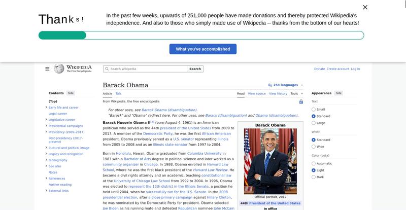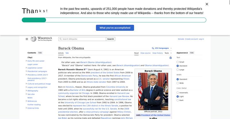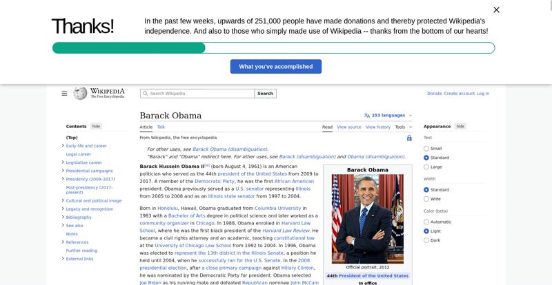 | Offenders: https://en.wikipedia.org/static/images/icons/wikipedia.png https://en.wikipedia.org/static/images/mobile/copyright/wikipedia-wordmark-en.svg https://en.wikipedia.org/static/images/mobile/copyright/wikipedia-tagline-en.svg https://upload.wikimedia.org/wikipedia/en/thumb/8/8c/Extended-protection-shackle...n-shackle.svg.png https://upload.wikimedia.org/wikipedia/commons/thumb/8/8d/President_Barack_Obama..._Barack_Obama.jpg https://upload.wikimedia.org/wikipedia/commons/thumb/1/11/Barack_Obama_signature...signature.svg.png https://upload.wikimedia.org/wikipedia/commons/thumb/e/e7/Obama_2008_portrait_cr...se_cropped%29.jpg https://upload.wikimedia.org/wikipedia/commons/thumb/3/36/Seal_of_the_President_...ed_States.svg.png https://upload.wikimedia.org/wikipedia/en/thumb/3/33/Ann_Dunham_with_father_and_..._and_children.jpg https://upload.wikimedia.org/wikipedia/commons/thumb/9/99/Barry_Soetoro_school_r...school_record.jpg https://upload.wikimedia.org/wikipedia/commons/thumb/1/1b/Nuvola_apps_kaboodle.s..._kaboodle.svg.png https://upload.wikimedia.org/wikipedia/commons/thumb/2/26/Obama_family_portrait_...he_Green_Room.jpg https://upload.wikimedia.org/wikipedia/commons/thumb/3/3d/Obamas_at_church_on_In...tion_Day_2013.jpg https://upload.wikimedia.org/wikipedia/commons/thumb/b/b6/Obamamiltondavis1.jpg/...amiltondavis1.jpg https://upload.wikimedia.org/wikipedia/commons/thumb/a/a4/Chicago%2C_November_2%...5471954323%29.jpg https://upload.wikimedia.org/wikipedia/commons/thumb/f/f1/BarackObamaportrait.jp...Obamaportrait.jpg https://upload.wikimedia.org/wikipedia/commons/thumb/2/24/ElectoralCollege2008.s...llege2008.svg.png https://upload.wikimedia.org/wikipedia/commons/thumb/3/33/Barack_obama_by_bill_c...y_bill_cramer.jpg https://upload.wikimedia.org/wikipedia/commons/thumb/4/44/ElectoralCollege2012.s...llege2012.svg.png https://upload.wikimedia.org/wikipedia/commons/thumb/a/a4/Modern_Liberalism_Flag...American_Flag.png https://upload.wikimedia.org/wikipedia/commons/thumb/1/1b/Yellow_flag_waving.svg...ag_waving.svg.png https://upload.wikimedia.org/wikipedia/en/thumb/a/a4/Flag_of_the_United_States.s...ed_States.svg.png https://upload.wikimedia.org/wikipedia/commons/thumb/d/d7/US_President_Barack_Ob...e_-_2009Jan20.jpg https://upload.wikimedia.org/wikipedia/commons/thumb/e/e9/Official_portrait_of_B..._Barack_Obama.jpg https://upload.wikimedia.org/wikipedia/commons/thumb/3/32/Barack_Obama_addresses...ss_2009-02-24.jpg https://upload.wikimedia.org/wikipedia/commons/thumb/4/4b/Barack_Obama_visiting_...rora_shooting.jpg https://upload.wikimedia.org/wikipedia/commons/thumb/f/fc/U.S._Total_Deficits_vs...ses_2001-2010.png https://upload.wikimedia.org/wikipedia/commons/thumb/2/25/US_Employment_Statisti...tatistics.svg.png https://upload.wikimedia.org/wikipedia/commons/thumb/9/9f/Job_Growth_by_U.S._Pre...resident_-_v1.png https://upload.wikimedia.org/wikipedia/commons/thumb/6/63/Obama-venice-la.jpg/25...ama-venice-la.jpg https://upload.wikimedia.org/wikipedia/commons/thumb/7/79/PPACA_Premium_Chart.jp...Premium_Chart.jpg https://upload.wikimedia.org/wikipedia/commons/thumb/8/84/Percentage_of_Individu...%2C_1963-2015.png https://upload.wikimedia.org/wikipedia/commons/thumb/9/99/P06409PS-0571_%2835946...3594694537%29.jpg https://upload.wikimedia.org/wikipedia/commons/thumb/6/6f/Barack_Obama%27s_trip_..._2016_%289%29.jpg https://upload.wikimedia.org/wikipedia/commons/thumb/7/70/Barack_Obama_with_Afgh...and_Joe_Biden.jpg https://upload.wikimedia.org/wikipedia/commons/thumb/a/ac/Obama_and_Biden_await_..._on_bin_Laden.jpg https://upload.wikimedia.org/wikipedia/commons/thumb/f/f6/Handshake_between_the_...C3%BAl_Castro.jpg https://upload.wikimedia.org/wikipedia/commons/thumb/1/1b/Barack_Obama_welcomes_...e_Oval_Office.jpg https://upload.wikimedia.org/wikipedia/commons/thumb/1/17/Barack_Obama_talks_wit...8637772147%29.jpg https://upload.wikimedia.org/wikipedia/commons/thumb/e/eb/Vladimir_Putin_and_Bar...5-09-29%29_01.jpg https://upload.wikimedia.org/wikipedia/commons/thumb/9/96/Obama_Macri_October_20..._October_2017.jpg https://upload.wikimedia.org/wikipedia/commons/thumb/1/15/P20220405AS-1082_%2852...2067439422%29.jpg https://upload.wikimedia.org/wikipedia/commons/thumb/2/28/Former_President_Barac...%28cropped%29.jpg https://upload.wikimedia.org/wikipedia/commons/thumb/b/b3/NewDemCoalition-logo.j...oalition-logo.jpg https://upload.wikimedia.org/wikipedia/en/thumb/0/01/A_coloured_voting_box.svg/2...oting_box.svg.png https://upload.wikimedia.org/wikipedia/commons/thumb/c/c0/Gallup_Poll-Approval_R...ack_Obama.svg.png https://upload.wikimedia.org/wikipedia/en/thumb/6/69/P_vip.svg/40px-P_vip.svg.png https://upload.wikimedia.org/wikipedia/en/thumb/a/a4/Flag_of_the_United_States.s...ed_States.svg.png https://upload.wikimedia.org/wikipedia/commons/thumb/e/ef/Flag_of_Hawaii.svg/40p...of_Hawaii.svg.png https://upload.wikimedia.org/wikipedia/commons/thumb/9/9b/Flag_of_Chicago%2C_Ill..._Illinois.svg.png https://upload.wikimedia.org/wikipedia/commons/thumb/0/01/Flag_of_Illinois.svg/4..._Illinois.svg.png https://upload.wikimedia.org/wikipedia/commons/thumb/1/17/Balance%2C_by_David.sv..._by_David.svg.png https://upload.wikimedia.org/wikipedia/en/thumb/0/01/A_coloured_voting_box.svg/4...oting_box.svg.png https://upload.wikimedia.org/wikipedia/commons/thumb/c/c1/Blue_iPod_Nano.jpg/20px-Blue_iPod_Nano.jpg https://upload.wikimedia.org/wikipedia/commons/thumb/9/9d/IPhone5white.png/20px-IPhone5white.png https://upload.wikimedia.org/wikipedia/en/thumb/4/4a/Commons-logo.svg/20px-Commons-logo.svg.png https://upload.wikimedia.org/wikipedia/commons/thumb/2/24/Wikinews-logo.svg/40px...news-logo.svg.png https://upload.wikimedia.org/wikipedia/commons/thumb/f/ff/Wikidata-logo.svg/40px...data-logo.svg.png https://upload.wikimedia.org/wikipedia/en/thumb/8/8a/OOjs_UI_icon_edit-ltr-progr...ogressive.svg.png https://upload.wikimedia.org/wikipedia/commons/thumb/2/21/Speaker_Icon.svg/20px-Speaker_Icon.svg.png https://upload.wikimedia.org/wikiped